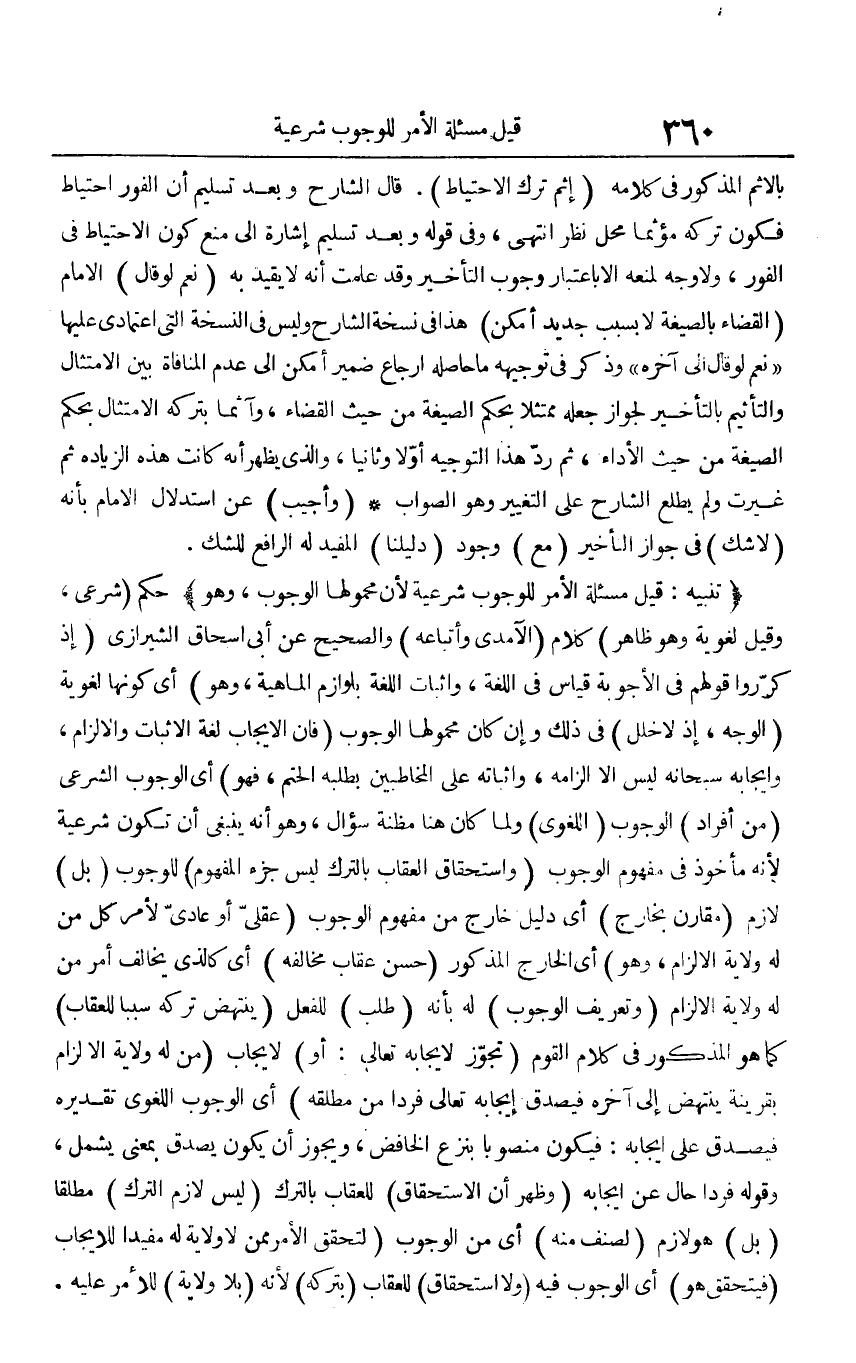 (تَنْبِيه: قيل مسئلة الْأَمر للْوُجُوب شَرْعِيَّة لِأَن محمولها الْوُجُوب، وَهُوَ) حكم (شَرْعِي، وَقيل لغوية وَهُوَ ظَاهر) كَلَام (الْآمِدِيّ وَأَتْبَاعه) وَالصَّحِيح عَن أبي إِسْحَاق الشِّيرَازِيّ (إِذْ كرروا قَوْلهم فِي الْأَجْوِبَة قِيَاس فِي اللُّغَة، وَإِثْبَات اللُّغَة بلوازم الْمَاهِيّة، وَهُوَ) أَي كَونهَا لغوية (الْوَجْه، إِذْ لَا خلل) فِي ذَلِك وَإِن كَانَ محمولها الْوُجُوب (فَإِن الْإِيجَاب لُغَة الْإِثْبَات والإلزام، وإيجابه سُبْحَانَهُ لَيْسَ إِلَّا إِلْزَامه، وإثباته على المخاطبين بِطَلَبِهِ الحتم، فَهُوَ) أَي الْوُجُوب الشَّرْعِيّ (من أَفْرَاد) الْوُجُوب (اللّغَوِيّ) وَلما كَانَ هُنَا مَظَنَّة سُؤال، وَهُوَ أَنه يَنْبَغِي أَن تكون شَرْعِيَّة لِأَنَّهُ مَأْخُوذ فِي مَفْهُوم الْوُجُوب (وَاسْتِحْقَاق الْعقَاب بِالتّرْكِ لَيْسَ جُزْء الْمَفْهُوم) للْوُجُوب (بل) لَازم (مُقَارن بِخَارِج) أَي دَلِيل خَارج من مَفْهُوم الْوُجُوب (عَقْلِي أَو عادي لأمر كل من لَهُ ولَايَة الْإِلْزَام، وَهُوَ) أَي الْخَارِج الْمَذْكُور (حسن عِقَاب مخالفه) أَي كَالَّذي يُخَالف أَمر من لَهُ ولَايَة الْإِلْزَام (وتعريف الْوُجُوب) لَهُ بِأَنَّهُ (طلب) للْفِعْل (ينتهض تَركه سَببا للعقاب) كَمَا هُوَ الْمَذْكُور فِي كَلَام الْقَوْم (تجوز لإيجابه تَعَالَى: أَو) لإِيجَاب (من لَهُ ولَايَة إِلَّا لزام بِقَرِينَة ينتهض إِلَى آخِره فَيصدق إِيجَابه تَعَالَى فَردا من مطلقه) أَي الْوُجُوب اللّغَوِيّ تَقْدِيره فَيصدق على إِيجَابه: فَيكون مَنْصُوبًا بِنَزْع الْخَافِض، وَيجوز أَن يكون يصدق بِمَعْنى يَشْمَل، وَقَوله فَردا حَال عَن إِيجَابه (وَظهر أَن الِاسْتِحْقَاق) للعقاب بِالتّرْكِ (لَيْسَ لَازم التّرْك) مُطلقًا (بل) هُوَ لَازم (لصنف مِنْهُ) أَي من الْوُجُوب (لتحَقّق الْأَمر مِمَّن لَا ولَايَة لَهُ مُفِيدا للْإِيجَاب (فَيتَحَقَّق هُوَ) أَي الْوُجُوب فِيهِ (وَلَا اسْتِحْقَاق) للعقاب (بِتَرْكِهِ) لِأَنَّهُ (بِلَا ولَايَة) لِلْأَمْرِ عَلَيْهِ.