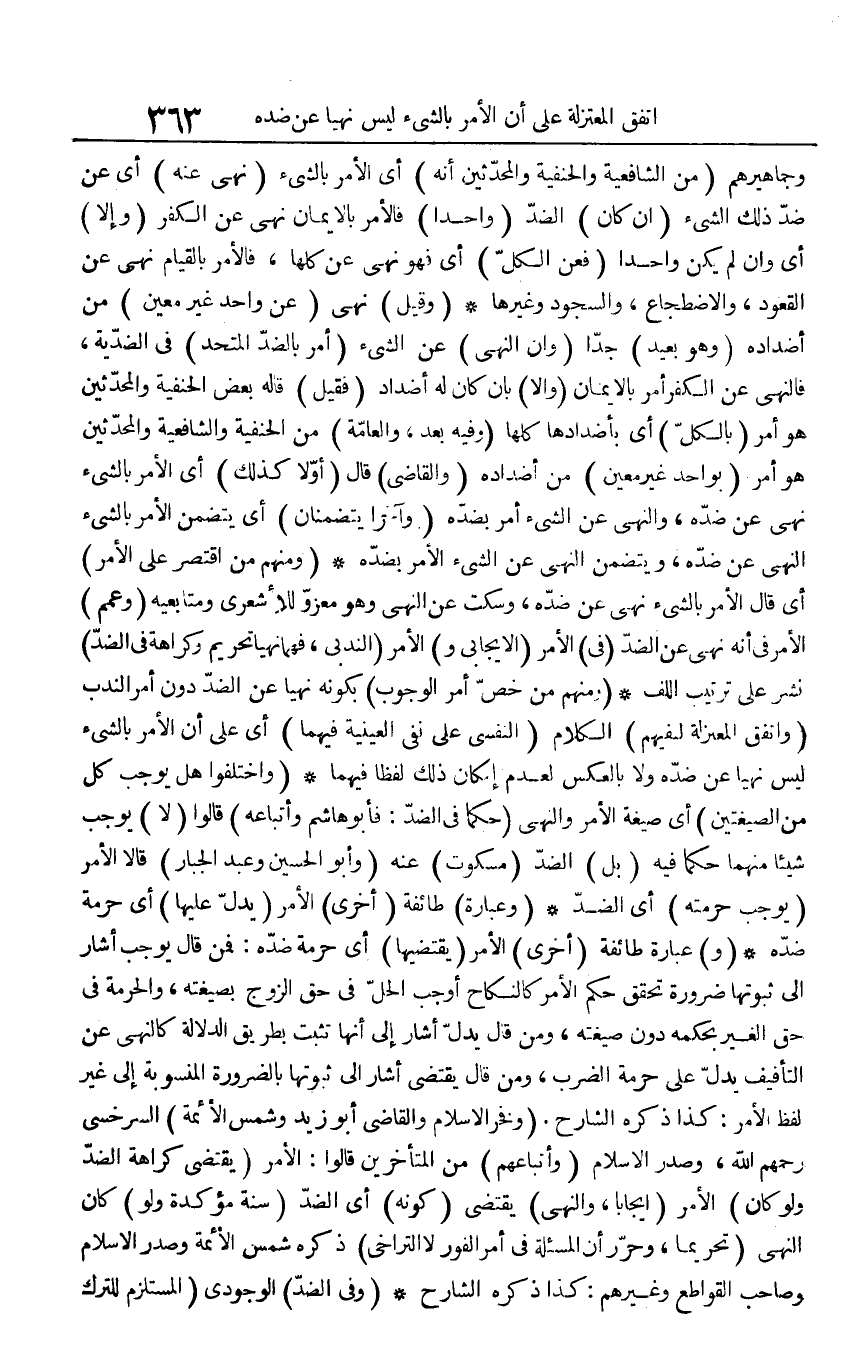 وجماهيرهم (من الشَّافِعِيَّة وَالْحَنَفِيَّة والمحدثين أَنه) أَي الْأَمر بالشَّيْء (نهى عَنهُ) أَي عَن ضد ذَلِك الشَّيْء (إِن كَانَ) الضِّدّ (وَاحِدًا) فَالْأَمْر بِالْإِيمَان نهى عَن الْكفْر (وَإِلَّا) أَي وَإِن لم يكن وَاحِدًا (فَعَن الْكل) أَي فَهُوَ نهى عَن كلهَا، فَالْأَمْر بِالْقيامِ نهى عَن الْقعُود، والاضطجاع، وَالسُّجُود وَغَيرهَا (وَقيل) نهى (عَن وَاحِد غير معِين) من أضداده (وَهُوَ بعيد) جدا (وَأَن النَّهْي) عَن الشَّيْء (أَمر بالضد المتحد) فِي الضدية، فالنهي عَن الْكفْر أَمر بِالْإِيمَان (وَإِلَّا) بِأَن كَانَ لَهُ أضداد (فَقيل) قَالَه بعض الْحَنَفِيَّة والمحدثين هُوَ أَمر (بِالْكُلِّ) أى بأضدادها كلهَا (وَفِيه بعد، والعامة) من الحنيفة وَالشَّافِعِيَّة والمحدثين هُوَ أَمر (بِوَاحِد غير معِين) من أضداده (وَالْقَاضِي) قَالَ (أَولا كَذَلِك) أَي الْأَمر بالشَّيْء نهى عَن ضِدّه، وَالنَّهْي عَن الشَّيْء أَمر بضده (وآخرا يتضمنان) أَي يتَضَمَّن الْأَمر بالشَّيْء النَّهْي عَن ضِدّه، ويتضمن النَّهْي عَن الشَّيْء الْأَمر بضده (وَمِنْهُم من اقْتصر على الْأَمر) أَي قَالَ الْأَمر بالشَّيْء نهى عَن ضِدّه، وَسكت عَن النَّهْي وَهُوَ معزو للأشعري ومتابعيه (وعمم) الْأَمر فِي أَنه نهى عَن الضِّدّ (فِي) الْأَمر (الإيجابي و) الْأَمر (الندبى، فهما نهيا تَحْرِيم وَكَرَاهَة فِي الضِّدّ) نشر على تَرْتِيب اللف (وَمِنْهُم من خص أَمر الْوُجُوب) بِكَوْنِهِ نهيا عَن الضِّدّ دون أَمر النّدب (وَاتفقَ الْمُعْتَزلَة لنفيهم) الْكَلَام (النَّفْسِيّ على نفي العينية فيهمَا) أَي على أَن الْأَمر بالشَّيْء لَيْسَ نهيا عَن ضِدّه وَلَا بِالْعَكْسِ لعدم إِمْكَان ذَلِك لفظا فيهمَا (وَاخْتلفُوا هَل يُوجب كل من الصيغتين) أَي صِيغَة الْأَمر وَالنَّهْي (حكما فِي الضِّدّ: فَأَبُو هَاشم وَأَتْبَاعه) قَالُوا (لَا) يُوجب شَيْئا مِنْهُمَا حكما فِيهِ (بل) الضِّدّ (مسكوت) عَنهُ (وَأَبُو الْحُسَيْن وَعبد الْجَبَّار) قَالَا الْأَمر (يُوجب حرمته) أَي الضِّدّ (وَعبارَة) طَائِفَة (أُخْرَى) الْأَمر (يدل عَلَيْهَا) أَي حُرْمَة ضِدّه (و) عبارَة طَائِفَة (أُخْرَى) الْأَمر (يقتضيها) أَي حُرْمَة ضِدّه: فَمن قَالَ يُوجب أَشَارَ إِلَى ثُبُوتهَا ضَرُورَة تحقق حكم الْأَمر كَالنِّكَاحِ أوجب الْحل فِي حق الزَّوْج بصيغته، وَالْحُرْمَة فِي حق الْغَيْر بِحكمِهِ دون صيغته، وَمن قَالَ يدل أَشَارَ إِلَى أَنَّهَا تثبت بطرِيق الدّلَالَة كالنهي عَن التأفيف يدل على حُرْمَة الضَّرْب، وَمن قَالَ يقتضى أَشَارَ إِلَى ثُبُوتهَا بِالضَّرُورَةِ المنسوبة إِلَى غير لفظ الْأَمر: كَذَا ذكره الشَّارِح. (وفخر الْإِسْلَام وَالْقَاضِي أَبُو زيد وشمس الْأَئِمَّة) السَّرخسِيّ رَحِمهم الله، وَصدر الْإِسْلَام (وأتباعهم) من الْمُتَأَخِّرين قَالُوا: الْأَمر (يَقْتَضِي كَرَاهَة الضِّدّ وَلَو كَانَ) الْأَمر (إِيجَابا، وَالنَّهْي) يَقْتَضِي (كَونه) أَي الضِّدّ (سنة مُؤَكدَة وَلَو) كَانَ النَّهْي (تَحْرِيمًا، وحرر أَن المسئلة فِي أَمر الْفَوْر لَا التَّرَاخِي) ذكره شمس الْأَئِمَّة وَصدر الْإِسْلَام وَصَاحب القواطع وَغَيرهم: كَذَا ذكره الشَّارِح (وَفِي الضِّدّ) الوجودي (المستلزم للترك