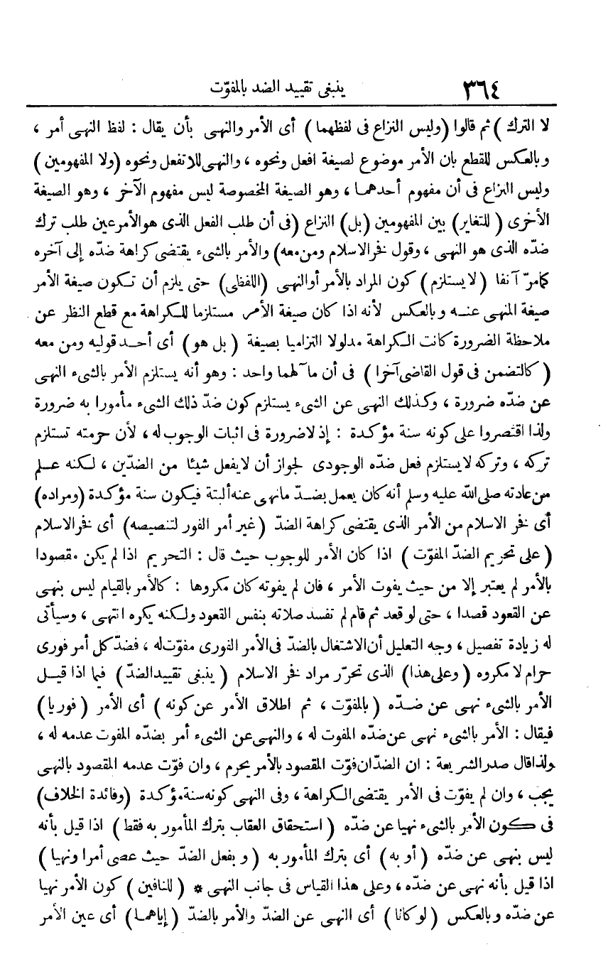 لَا التّرْك) ثمَّ قَالُوا (وَلَيْسَ النزاع فِي لَفْظهمَا) أَي الْأَمر وَالنَّهْي بِأَن يُقَال: لفظ النَّهْي أَمر، وَبِالْعَكْسِ للْقطع بِأَن الْأَمر مَوْضُوع لصيغة افْعَل وَنَحْوه، وَالنَّهْي للا تفعل وَنَحْوه (وَلَا المفهومين) وَلَيْسَ النزاع فِي أَن مَفْهُوم أَحدهمَا، وَهُوَ الصِّيغَة الْمَخْصُوصَة لَيْسَ مَفْهُوم الآخر، وَهُوَ الصِّيغَة الْأُخْرَى (للتغاير) بَين المفهومين (بل) النزاع (فِي أَن طلب الْفِعْل الَّذِي هُوَ الْأَمر عين طلب ترك ضِدّه الَّذِي هُوَ النَّهْي، وَقَول فَخر الْإِسْلَام وَمن مَعَه) وَالْأَمر بالشَّيْء يقتضى كَرَاهَة ضِدّه إِلَى آخِره كَمَا مر آنِفا (لَا يسْتَلْزم) كَون المُرَاد بِالْأَمر أوالنهي (اللَّفْظِيّ) حَتَّى يلْزم أَن تكون صِيغَة الْأَمر صِيغَة الْمنْهِي عَنهُ وَبِالْعَكْسِ لِأَنَّهُ إِذا كَانَ صِيغَة الْأَمر مستلزما للكراهة مَعَ قطع النّظر عَن مُلَاحظَة الضَّرُورَة كَانَت الْكَرَاهَة مدلولا التزاميا بِصِيغَة (بل هُوَ) أَي أحد قوليه وَمن مَعَه (كالتضمن فِي قَول القَاضِي آخرا) فِي أَن مآلهما وَاحِد: وَهُوَ أَنه يسْتَلْزم الْأَمر بالشَّيْء النَّهْي عَن ضِدّه ضَرُورَة، وَكَذَلِكَ النَّهْي عَن الشَّيْء يسْتَلْزم كَون ضد ذَلِك الشَّيْء مَأْمُورا بِهِ ضَرُورَة وَلذَا اقتصروا على كَونه سنة مُؤَكدَة: إِذْ لَا ضَرُورَة فِي إِثْبَات الْوُجُوب لَهُ، لِأَن حرمته تَسْتَلْزِم تَركه، وَتَركه لَا يسْتَلْزم فعل ضِدّه الوجودي لجَوَاز أَن لَا يفعل شَيْئا من الضدين، لكنه علم من عَادَته صلى الله عَلَيْهِ وَسلم أَنه كَانَ يعْمل بضد مَا نهى عَنهُ أَلْبَتَّة فَيكون سنة مُؤَكدَة (وَمرَاده) أَي فَخر الْإِسْلَام من الْأَمر الَّذِي يقتضى كَرَاهَة الضِّدّ (غير أَمر الْفَوْر لتنصيصه) أَي فَخر الْإِسْلَام (على تَحْرِيم الضِّدّ المفوت) إِذا كَانَ الْأَمر للْوُجُوب حَيْثُ قَالَ: التَّحْرِيم إِذا لم يكن مَقْصُودا بِالْأَمر لم يعْتَبر إِلَّا من حَيْثُ يفوت الْأَمر، فَإِن لم يفوتهُ كَانَ مَكْرُوها: كالأمر بِالْقيامِ لَيْسَ بنهي عَن الْقعُود قصدا، حَتَّى لَو قعد ثمَّ قَامَ لم تفْسد صلَاته بِنَفس الْقعُود وَلكنه يكره انْتهى، وَسَيَأْتِي لَهُ زِيَادَة تَفْصِيل، وَجه التَّعْلِيل أَن الِاشْتِغَال بالضد فِي الْأَمر الفوري مفوت لَهُ، فضد كل أَمر فوري حرَام لَا مَكْرُوه (وعَلى هَذَا) الَّذِي تحرر مُرَاد فَخر الْإِسْلَام (يَنْبَغِي تَقْيِيد الضِّدّ) فِيمَا إِذا قيل الْأَمر بالشَّيْء نهي عَن ضِدّه (بالمفوت، ثمَّ إِطْلَاق الْأَمر عَن كَونه) أَي الْأَمر (فوريا) فَيُقَال: الْأَمر بالشَّيْء نهي عَن ضِدّه المفوت لَهُ، وَالنَّهْي عَن الشَّيْء أَمر بضده المفوت عَدمه لَهُ، وَلذَا قَالَ صدر الشَّرِيعَة: أَن الضدان فَوت الْمَقْصُود بِالْأَمر يحرم، وَإِن فَوت عَدمه الْمَقْصُود بِالنَّهْي يجب، وَإِن لم يفوت فِي الْأَمر يَقْتَضِي الْكَرَاهَة، وَفِي النَّهْي كَونه سنة مُؤَكدَة (وَفَائِدَة الْخلاف) فِي كَون الْأَمر بالشَّيْء نهيا عَن ضِدّه (اسْتِحْقَاق الْعقَاب بترك الْمَأْمُور بِهِ فَقَط) إِذا قيل بِأَنَّهُ لَيْسَ بنهي عَن ضِدّه (أَو بِهِ) أَي بترك الْمَأْمُور بِهِ (وبفعل الضِّدّ حَيْثُ عصى أمرا ونهيا) إِذا قيل بِأَنَّهُ نهي عَن ضِدّه، وعَلى هَذَا الْقيَاس فِي جَانب النَّهْي (للنافين) كَون الْأَمر نهيا عَن ضِدّه وَبِالْعَكْسِ (لَو كَانَا) أَي النَّهْي عَن الضِّدّ وَالْأَمر بالضد (إيَّاهُمَا) أَي عين الْأَمر