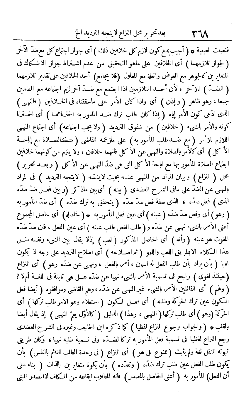 فتعينت العينية (أُجِيب بِمَنْع كَون لَازم كل خلافين ذَلِك) أَي جَوَاز اجْتِمَاع كل مَعَ ضد الآخر (لجَوَاز تلازمهما) أَي الخلافين على مَا هُوَ التَّحْقِيق من عدم اشْتِرَاط جَوَاز الانفكاك فِي المتغايرين كالجوهر مَعَ الْعرض وَالْعلَّة مَعَ الْمَعْلُول (فَلَا يُجَامع) أحد الخلافين على تَقْدِير تلازمهما (الضِّدّ) للْآخر، لِأَن أحد المتلازمين إِذا اجْتمع مَعَ ضد آخر لزم اجتماعه مَعَ الضدين جَمِيعًا، وَهُوَ ظَاهر (وَإِذن) أَي وَإِذا كَانَ الْأَمر على مَا حققناه فِي الخلافين (فالنهي) الَّذِي ادّعى كَون الْأَمر إِيَّاه (إِذا كَانَ ترك ضد الْمَأْمُور بِهِ اخترناهما) أَي اخترنا كَونه وَالْأَمر بالشَّيْء (خلافين) من شقوق الترديد (وَلَا يجب اجتماعه) أَي اجْتِمَاع النَّهْي اللَّازِم لِلْأَمْرِ (مَعَ ضد طلب الْمَأْمُور بِهِ) على مَا زَعمه القَاضِي (كَالصَّلَاةِ مَعَ إِبَاحَة الْأكل) أَي كالأمر بِالصَّلَاةِ وَالنَّهْي عَن الْأكل فَإِنَّهُمَا خلافان، وَلَا يلْزم من كَونهمَا خلافين اجْتِمَاع الصَّلَاة الْمَأْمُور بهَا مَعَ إِبَاحَة الْأكل الَّتِي هِيَ ضد النَّهْي عَن الْأكل (وَبعد تَحْرِير مَحل (النزاع) وَبَيَان المُرَاد من الْمنْهِي عَنهُ بِحَيْثُ لَا يشْتَبه (لَا يتَّجه الترديد) فِي المُرَاد بِالنَّهْي عَن الضِّدّ على مَا فِي الشَّرْح العضدي (بَينه) أَي بَين مَا ذكر (وَبَين فعل ضد ضِدّه الَّذِي) فعل ضِدّه، الَّذِي صفة فعل ضد ضِدّه (يتَحَقَّق بِهِ ترك ضِدّه) أَي ضد الْمَأْمُور بِهِ (وَهُوَ) أَي وَفعل ضد ضِدّه (عينه) أَي عين فعل الْمَأْمُور بِهِ (فحاصله) أَي حَاصِل الْمَجْمُوع أَعنِي الْأَمر بالشَّيْء نهى عَن ضِدّه و (طلب الْفِعْل طلب عينه) أَي عين الْفِعْل، فَإِن ضد ضِدّه المفوت هُوَ عينه (وَأَنه) أَي الْحَاصِل الْمَذْكُور (لعب) إِذْ لَا يُقَال بَين الشَّيْء ونفيه مثل هَذَا الْكَلَام إِلَّا بطرِيق اللّعب وَاللَّهْو (ثمَّ إِصْلَاحه) أَي إصْلَاح الترديد على وَجه لَا يكون لعبا (بِأَن يُرَاد بِأَن طلب الْفِعْل لَهُ اسمان، أَمر بِالْفِعْلِ، وَنهى عَن ضِدّه وَهُوَ) أَي النزاع (حِينَئِذٍ لغَوِيّ) رَاجع إِلَى تَسْمِيَة الْأَمر بالشَّيْء نهيا عَن ضِدّه هَل هِيَ ثَابِتَة فِي اللُّغَة أم لَا؟ (وَلَهُم) أَي الْقَائِلين الْأَمر بالشَّيْء غير النَّهْي عَن ضِدّه، وهم القَاضِي وموافقوه (أَيْضا فعل السّكُون عين ترك الْحَرَكَة وَطَلَبه) أَي فعل السّكُون (استعلاء وَهُوَ الْأَمر طلب تَركهَا) أَي الْحَرَكَة (وَهُوَ) أَي طلب تَركهَا (النَّهْي، وَهَذَا) الدَّلِيل (كَالْأولِ يعم النَّهْي) إِذْ يُقَال أَيْضا بِالْقَلْبِ (وَالْجَوَاب بِرُجُوع النزاع لفظيا) كَمَا ذكره ابْن الْحَاجِب وَغَيره فِي الشَّرْح العضدي رَجَعَ النزاع لفظيا فِي تَسْمِيَة فعل الْمَأْمُور بِهِ تركا لضده وَفِي تَسْمِيَة طلبه نهيا، وَكَانَ طَرِيق ثُبُوته النَّقْل لُغَة وَلم يثبت (مَمْنُوع بل هُوَ) أَي النزاع (فِي وحدة الطّلب الْقَائِم بِالنَّفسِ) بِأَن يكون طلب الْفِعْل عين طلب ترك ضِدّه (وتعدده) بِأَن يَكُونَا متغايرين بِالذَّاتِ (بِنَاء على أَن الْفِعْل) الْمَأْمُور بِهِ (أَعنِي الْحَاصِل بِالْمَصْدَرِ) فَإِنَّهُ الْمَطْلُوب إِيقَاعه من الْمُكَلف لَا الْمصدر الْمَبْنِيّ