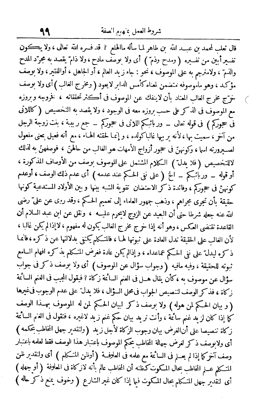 قَالَ ثَعْلَب لمُحَمد بن عبد الله بن طَاهِر لما سَأَلَهُ مَا الْهَلَع؟ قد فسره الله تَعَالَى، وَلَا يكون تَفْسِير أبين من تَفْسِيره (ومدح وذم) أَي وَلَا بِوَصْف مادح، وَلَا ذام يقْصد بِهِ مُجَرّد الْمَدْح والذم، وَلَا مترجم بِهِ على الْمَوْصُوف، نَحْو جَاءَ زيد الْعَالم، أَو الْجَاهِل، أَو الْفَقِير، وَلَا بِوَصْف مُؤَكد، وَهُوَ مَا موصوفه مُتَضَمّن لمعناه كأمس الدابر لَا يعود (ومخرج الْغَالِب) أَي وَلَا بِوَصْف خرج مخرج الْغَالِب الْمُعْتَاد بِأَن لَا يَنْفَكّ عَن الْمَوْصُوف فِي أَكثر تحققاته، فخروجه وبروزه مَعَ الْمَوْصُوف فِي الذّكر على حسب بروزه مَعَه فِي الْوُجُود، وَلَا يقْصد بِهِ التَّخْصِيص (كاللاتي فِي جحوركم) فِي قَوْله تَعَالَى - {وربائبكم اللَّاتِي فِي حجوركم} - جمع ربيبة، بنت زَوْجَة الرجل من آخر، سميت بهَا، لِأَنَّهُ يُرَبِّيهَا غَالِبا كولده، وَإِنَّمَا لحقته الْهَاء، مَعَ أَنه فعيل بِمَعْنى مفعول لصيرورته اسْما، وكونهن فِي حجور أَزوَاج الْأُمَّهَات هُوَ الْغَالِب من حالهن، فوصفهن بِهِ لذَلِك لَا للتخصيص (فَلَا يدل) الْكَلَام الْمُشْتَمل على الْمَوْصُوف بِوَصْف من الْأَوْصَاف الْمَذْكُورَة، أَو قَوْله - {وربائبكم} - الخ (على نفي الحكم عِنْد عَدمه) أَي عدم ذَلِك الْوَصْف، أَو عدم كونهن فِي حجوركم، وَفَائِدَة ذكر الاحتضان تَقْوِيَة الشّبَه بَينهَا وَبَين الْأَوْلَاد المستدعية كَونهَا حَقِيقَة بِأَن تجْرِي مجراهم، وَذهب جُمْهُور الْعلمَاء إِلَى تَعْمِيم الحكم، وَقد روى عَن عَليّ رَضِي الله عَنهُ جعله شرطا حَتَّى أَن الْبعيد عَن الزَّوْج لَا يحرم عَلَيْهِ، وَنقل عَن ابْن عبد السَّلَام أَن الْقَاعِدَة تَقْتَضِي الْعَكْس، وَهُوَ أَنه إِذا خرج مخرج الْغَالِب يكون لَهُ مَفْهُوم، لَا إِذا لم يكن غَالِبا، لِأَن الْغَالِب على الْحَقِيقَة تدل الْعَادة على ثُبُوتهَا لَهَا، فالمتكلم يَكْتَفِي بدلالتها عَن ذكره، فَإِنَّمَا ذكره ليدل على نفي الحكم عَمَّا عداهُ، وَإِذا لم يكن عَادَة فغرض الْمُتَكَلّم بِذكرِهِ إفهام السَّامع ثُبُوته للْحَقِيقَة، وَفِيه مَا فِيهِ (وَجَوَاب سُؤال عَن الْمَوْصُوف) أَي وَلَا بِوَصْف ذكر فِي جَوَاب سُؤال عَن مَوْصُوف بِهِ، كَأَن يُقَال هَل فِي الْغنم السَّائِمَة زَكَاة؟ فَيَقُول الْمُجيب فِي الْغنم السَّائِمَة زَكَاة، فَذكر الْوَصْف لتنصيص الْجَواب فِي مَحل السُّؤَال، فَلَا يدل على عدم الْوُجُوب فِي غَيرهَا (وَبَيَان الحكم لمن هوله) وَلَا بِوَصْف ذكر لبَيَان الحكم لمن لَهُ الْمَوْصُوف بِهَذَا الْوَصْف كَمَا إِذا كَانَ لزيد غنم سَائِمَة، وَأَنت تُرِيدُ بَيَان حكم غنم زيد لَا غَيره، فَتَقول فِي الْغنم السَّائِمَة زَكَاة تنصيصا على أَن الْغَرَض بَيَان وجوب الزَّكَاة لأجل زيد (ولتقدير جهل الْمُخَاطب بِحكمِهِ) أَي وَلَا بِوَصْف ذكر لغَرَض جَهَالَة الْمُخَاطب بِحكم الْمَوْصُوف بِاعْتِبَار هَذَا الْوَصْف فَقَط لعلمه بِاعْتِبَار وصف آخر كَمَا إِذا لم يعلم فِي السَّائِمَة مَعَ علمه فِي العلوفة (أَو ظن الْمُتَكَلّم) أَي ولتقدير ظن الْمُتَكَلّم علم الْمُخَاطب بِحَال الْمَسْكُوت كظنه أَن الْمُخَاطب عَالم بِأَنَّهُ لَا زَكَاة فِي المعلوفة (أَو جَهله) أَي لتقدير جهل الْمُتَكَلّم بِحَال الْمَسْكُوت فِيمَا إِذا كَانَ غير الشَّارِع (وَخَوف يمْنَع ذكر حَاله)