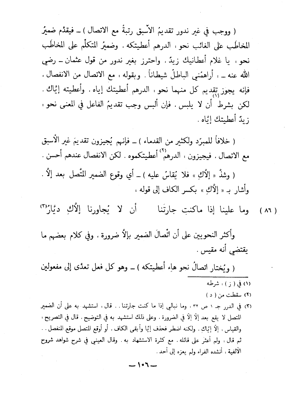 (ووجب في غير ندور تقديم الأسبق رتبة مع الاتصال) -فيقدم ضمير المخاطب على الغائب نحو: الدرهم أعطيتكه، وضمير المتكلم على المخاطب نحو: يا غلام أعطانيك زيد، واحترز بغير ندور من قول عثمان -رضي الله عنه-: أراهمني الباطل شيطانًا، وبقوله: مع الاتصال من الانفصال، فإنه يجوز تقديم كل منهما نحو: الدرهم أعطيتك إياه، وأعطيته إياك لكن بشرط أن لا يلبس، فإن ألبس وجب تقديم الفاعل في المعنى نحو: زيد أعطيتك إياه.