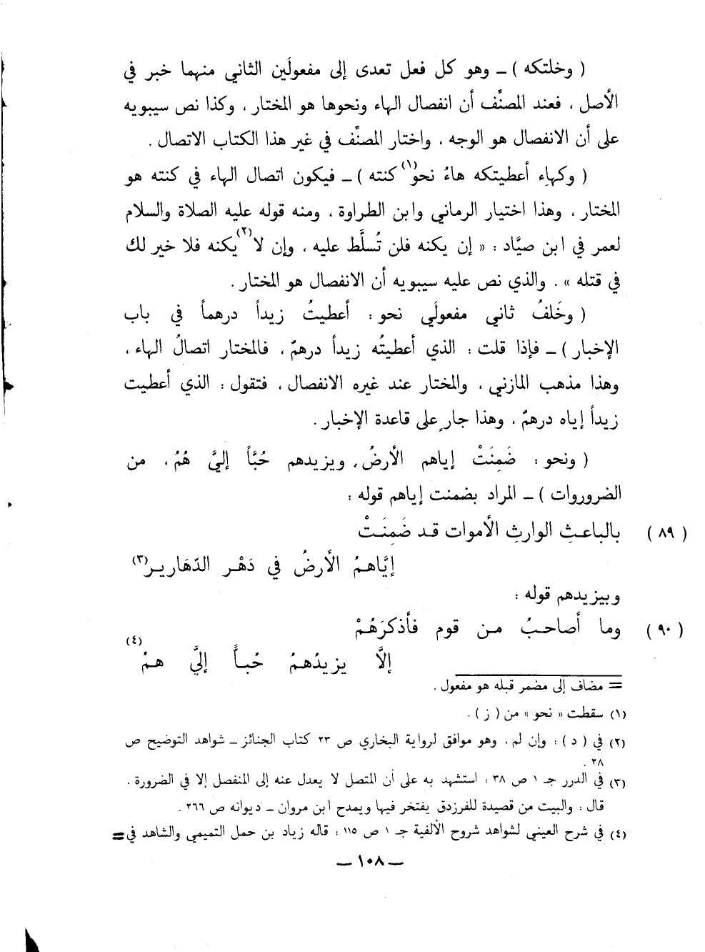 (وكهاء أعطيتكه هاء نحو كنته) -فيكون اتصال الهاء في كنته هو المختار، وهذا اختيار الرماني وابن الطراوة، ومنه قوله عليه الصلاة والسلام لعمر في ابن صياد: "إن يكنه فلن تسلط عليه، وإن لا يكنه فلا خير لك في قتله". والذي نص عليه سيبويه أن الانفصال هو المختار.