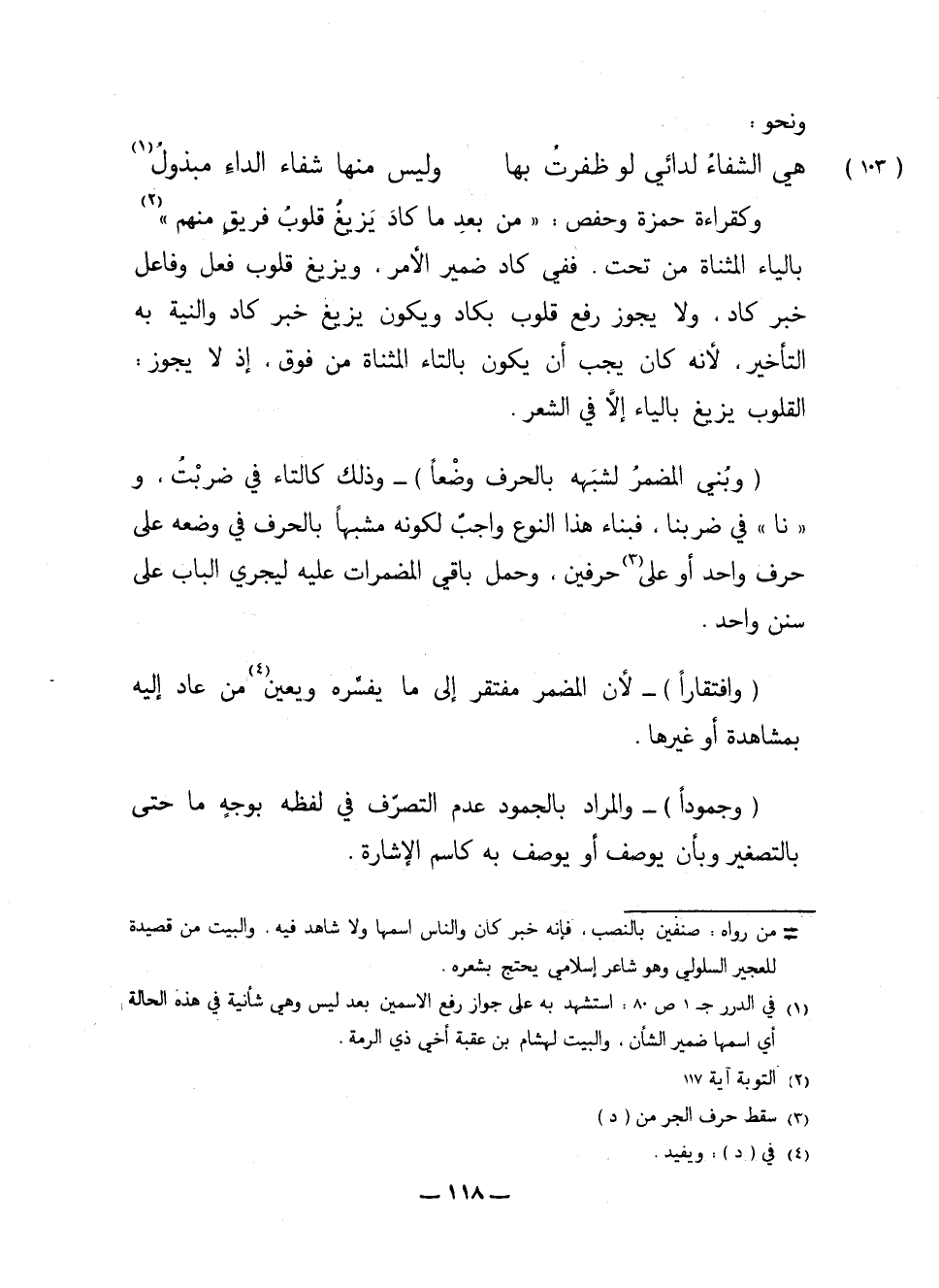 وكقراءة حمزة وحفص: "من بعد ما كاد يزيغ قلوب فريق منهم" بالياء المثناة من تحت، ففي كاد ضمير الأمر، ويزيغ قلوب فعل وفاعل خبر كاد، ولا يجوز رفع قلوب بكاد ويكون يزيغ خبر كاد والنية به التأخير، لأنه كان يجب أن يكون بالتاء المثناة من فوق، إذ لا يجوز: القلوب يزيغ بالياء إلا في الشعر.