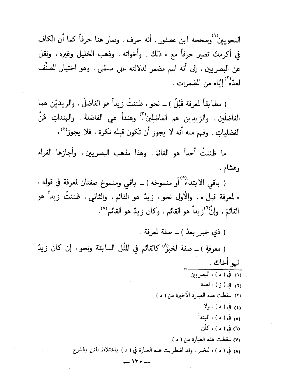 (مطابًا لمعرفة قبل) -نحو: ظننت زيدًا هو الفاضل، والزيدين هما الفاضلين، والزيدين هم الفاضلين، وهندًا هي الفاضل، والهندات هن الفضليات، وفهم منه أنه لا يجوز أن تكون قبله نكرة، فلا يجوز.