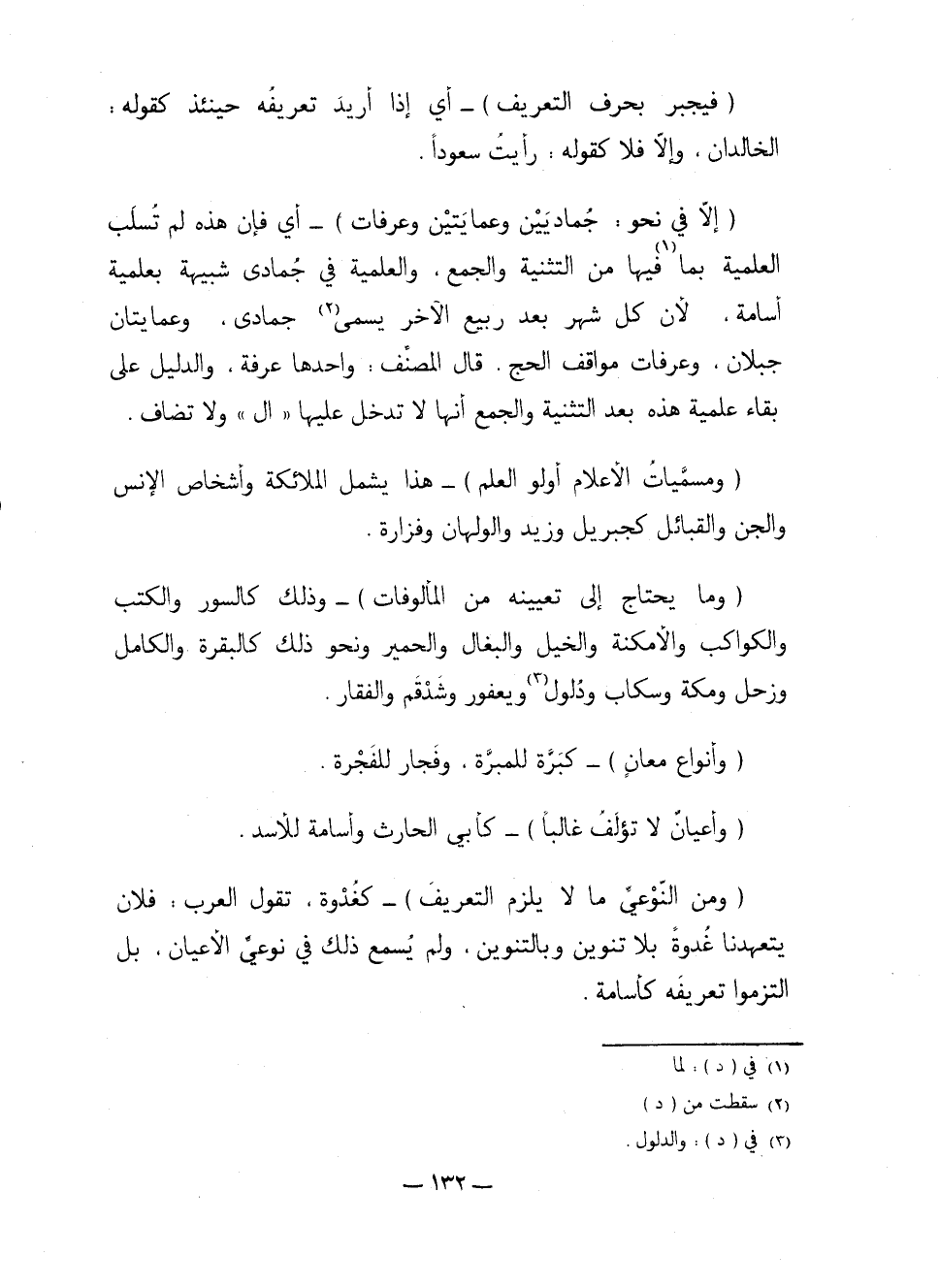 (وما يحتاج إلى تعيينه من المألوفات) -وذلك كالسور والكتب والكواكب والأمكنة والخيل والبغال والحمير ونحو ذلك كالبقرة والكامل وزحل مكة وسكاب ودلول ويعفور وشدقم والفقار.