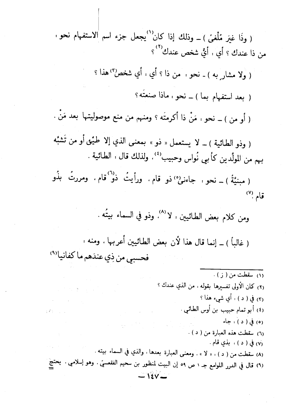 (وذو الطائية) -لا يستعمل "ذو" بمعنى الذي إلا طيئ أو من تشبه بهم من المولدين كأبي نواس وحبيب، ولذلك قال: الطائية.