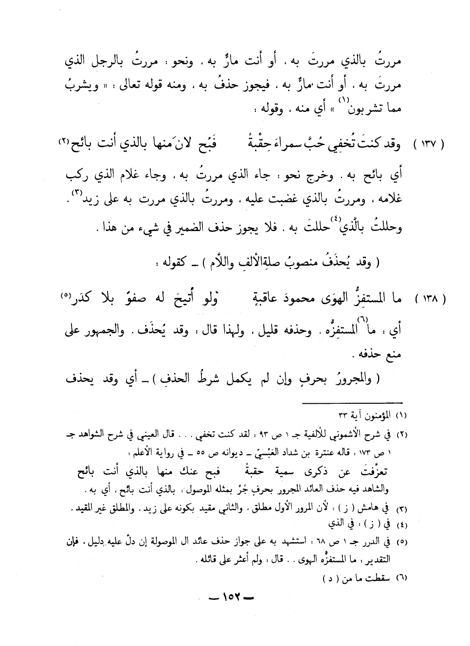 مررت بالذي مررت به، أو أنت مار به، ونحو: مررت بالرجل الذي مررت به، أو أنت مار به، فيجوز حذف به، ومنه قوله تعالى: "ويشرب مما تشربون" أي منه، وقوله: