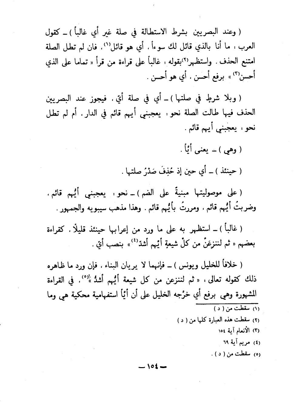 (خلافًا للخليل ويونس) -فإنهما لا يريان البناء، فإن ورد ما ظاهره ذلك كقوله تعالى: "ثم لتنزعن من كل شيعة أيهم أشد"، في القراءة المشهورة وهي برفع أي خرجه الخليل على أن أيًا استفهامية محكية هي وما