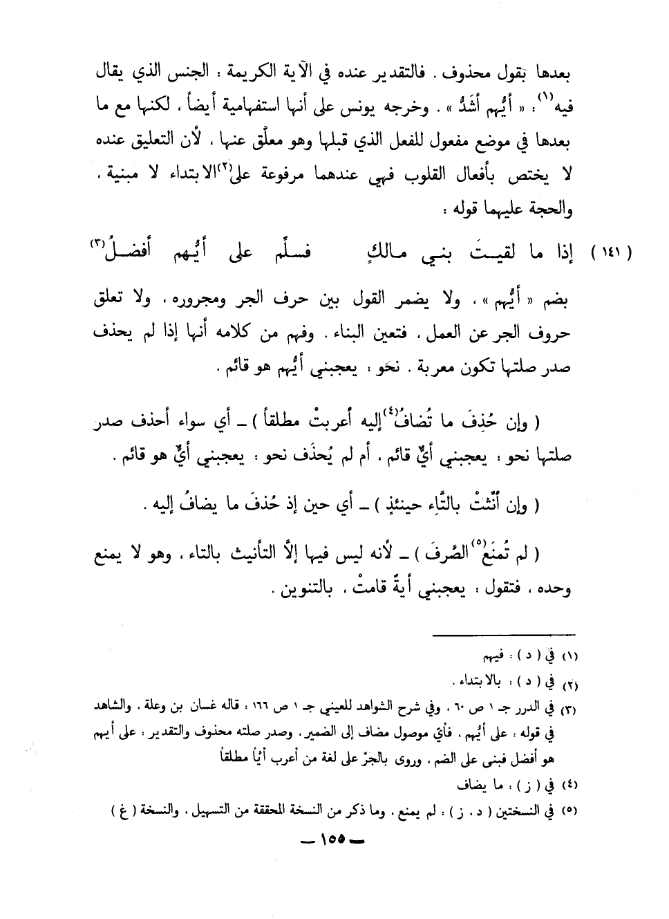 بضم "أيهم"، ولا يضمر القول بين حرف الجر ومجروره، ولا تعلق حروف الجر عن العمل، فتعين البناء، وفهم من كلامه أنها إذا لم يحذف صدر صلتها تكون معربة، نحو: يعجبني أيهم هو قائم.