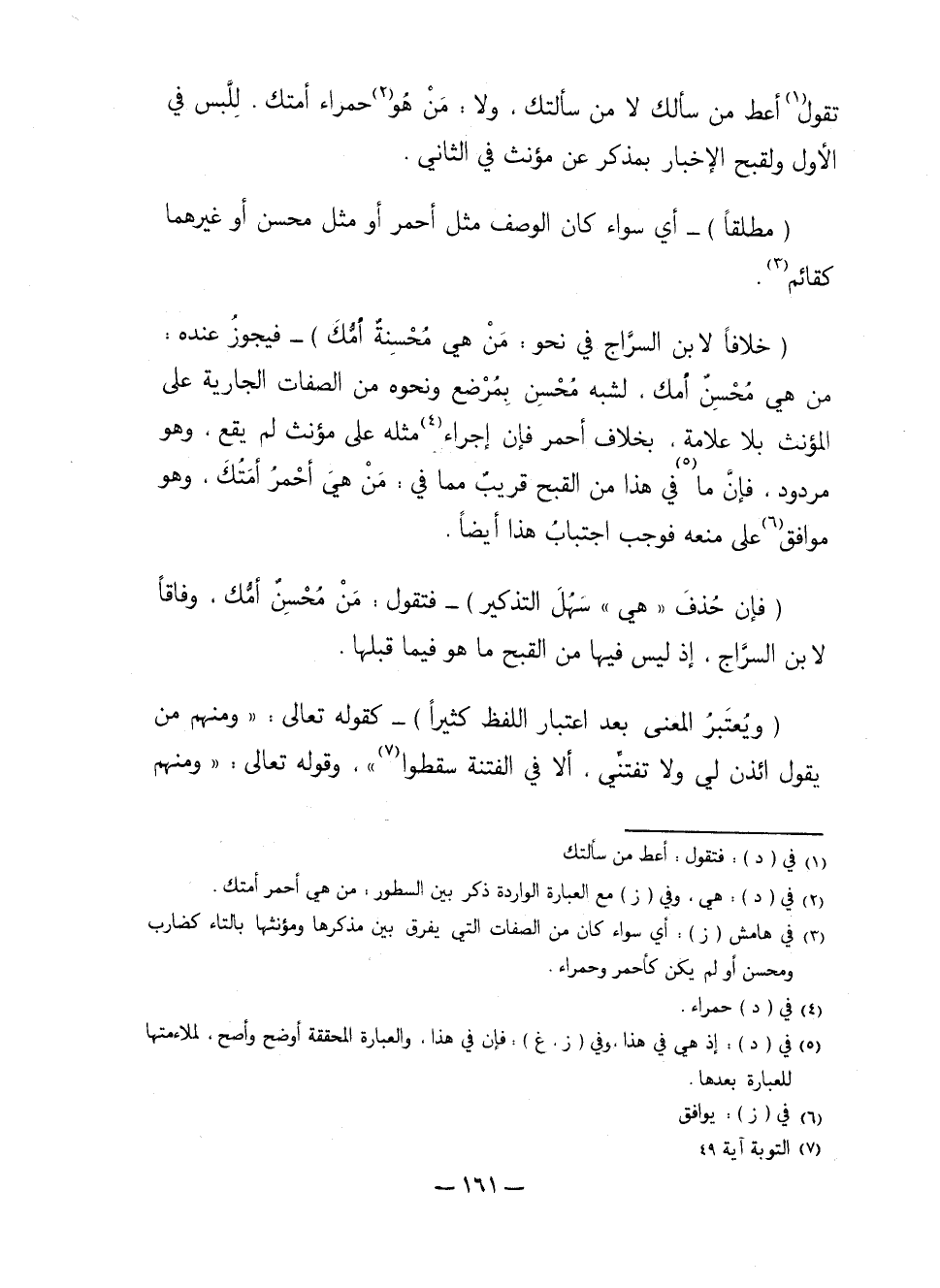 تقول أعط من سألك لا من سألتك، ولا: من هو حمراء أمتك، للبس في الأول ولقبح الإخبار بمذكر عن مؤنث في الثاني.