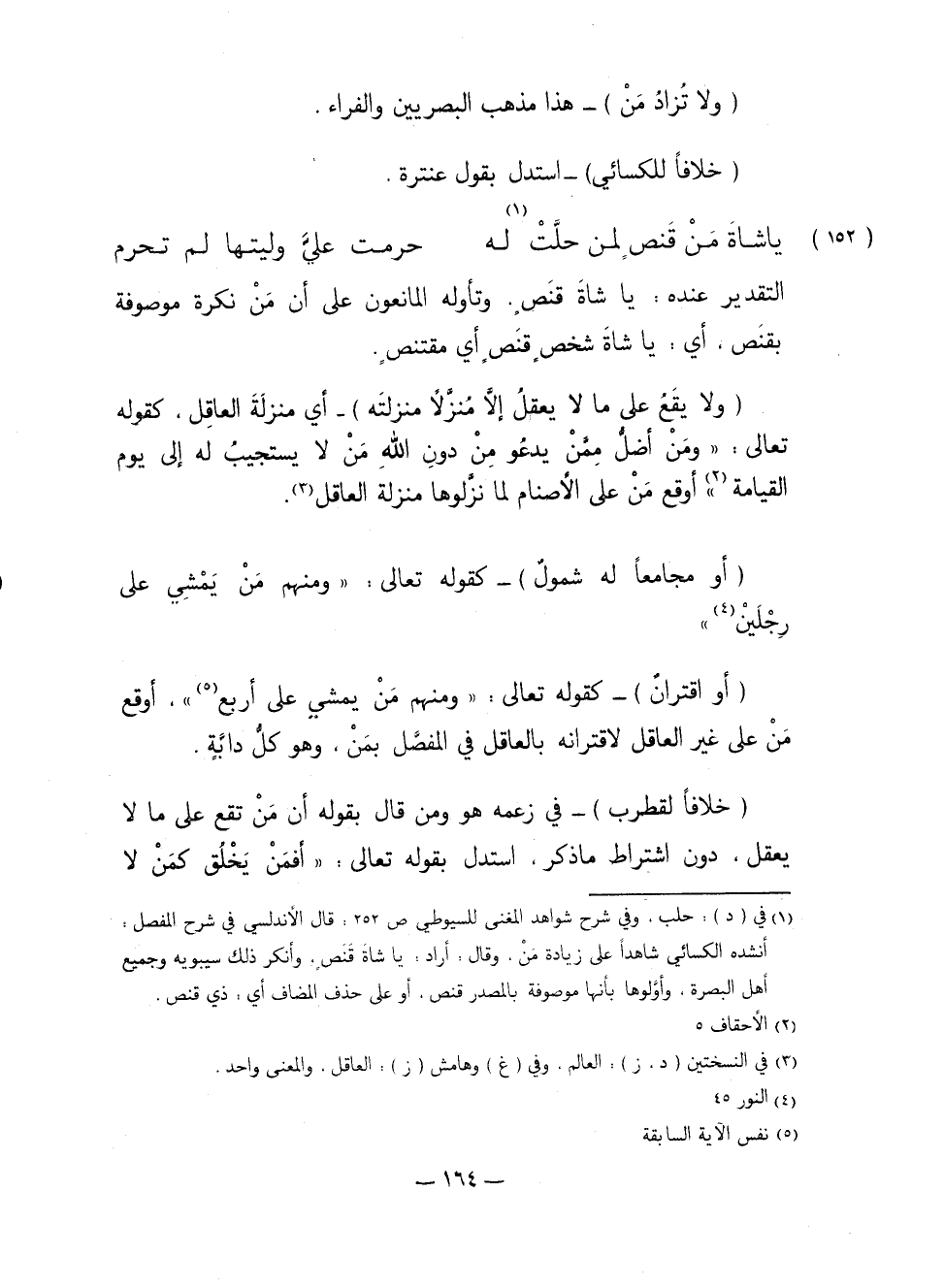 (خلافًا لقطرب) -في زعمه هو ومن قال بقوله أن من تقع على ما لا يعقل، دون اشتراط ما ذكر، استدل بقوله تعالى: "أفمن يخلق كمن لا