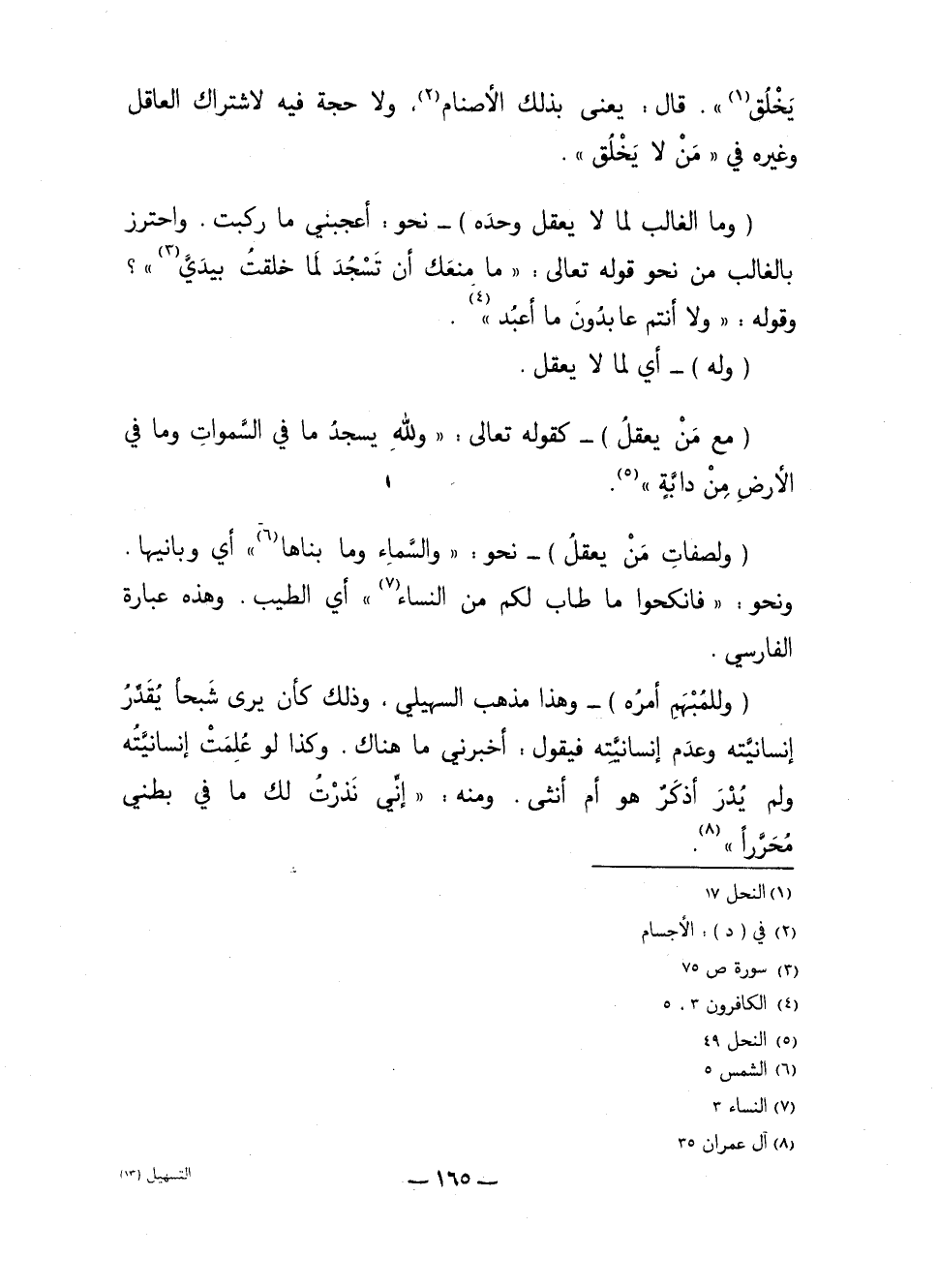 (وللمبهم أمره) -وهذا مذهب السهيلي، وذلك كأن يرى شبحًا يقدر إنسانيته وعدم إنسانيته فيقول: أخبرني ما هناك، وكذا لو علمت إنسانيته ولم يدر أذكر هو أم أثنى. ومنه: "إني نذرت لك ما في بطني محررًا".