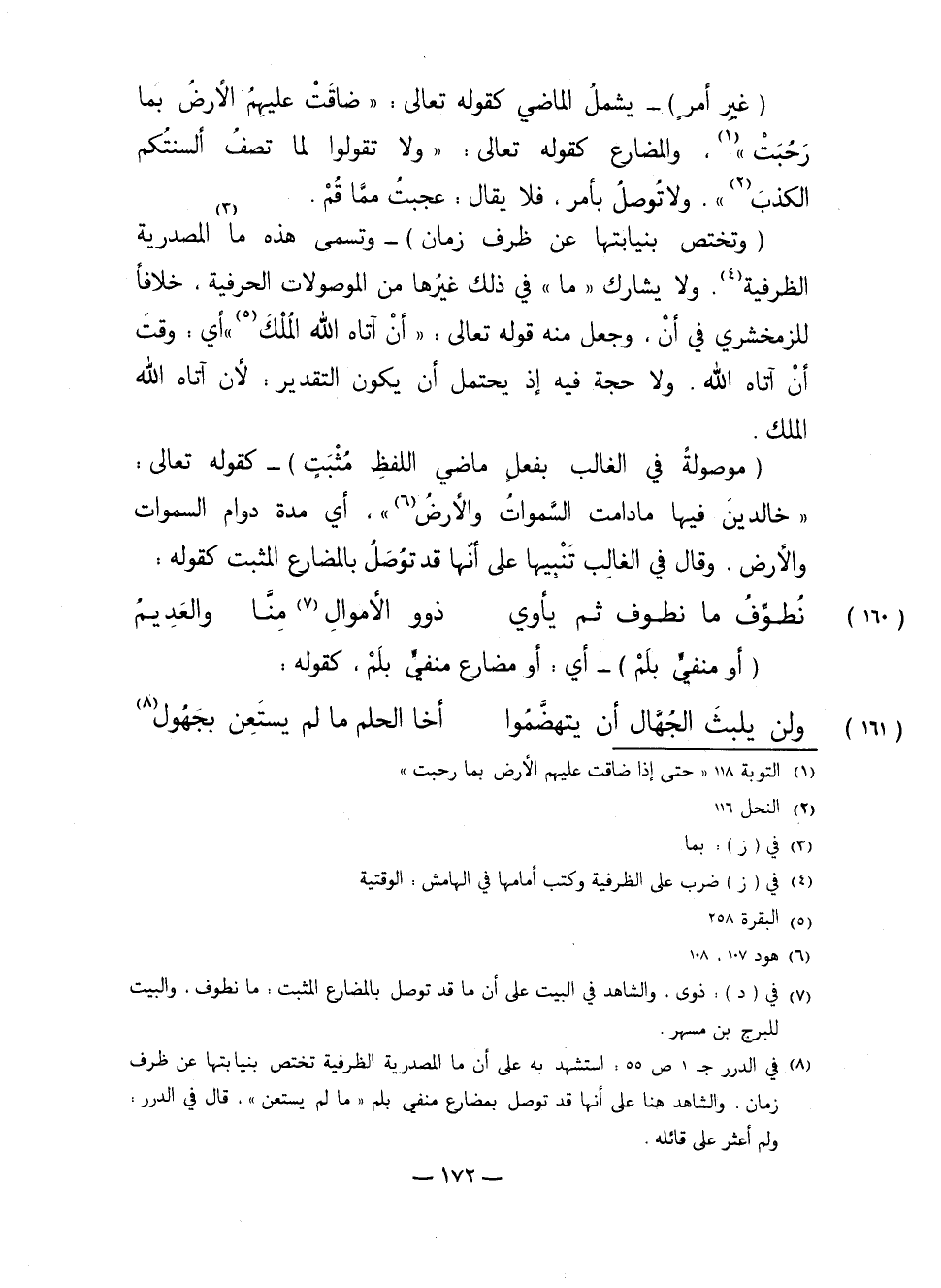 (وتختص بنيابتها عن ظرف زمان) -وتسمى هذه ما المصدرية الظرفية، ولا يشارك "ما" في ذلك غيرها من الموصولات الحرفية، خلافًا للزمخشري في أن، وجعل منه قوله تعالى: "أن آتاه الله الملك" أي: وقت أن آتاه الله، ولا حجة فيه إذ يحتمل أن يكون التقدير: لأن آتاه الله الملك.