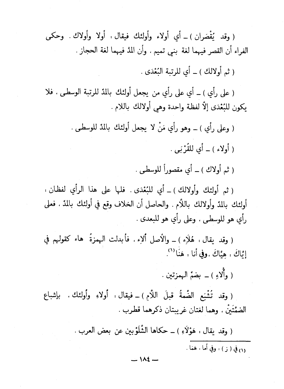 (وقد يقصران) -أي أولاء وأولئك فيقال: أولا وأولاك، وحكى الفراء أن القصر فيهما لغة بني تميم، وأن املد فيهما لغة الحجاز.