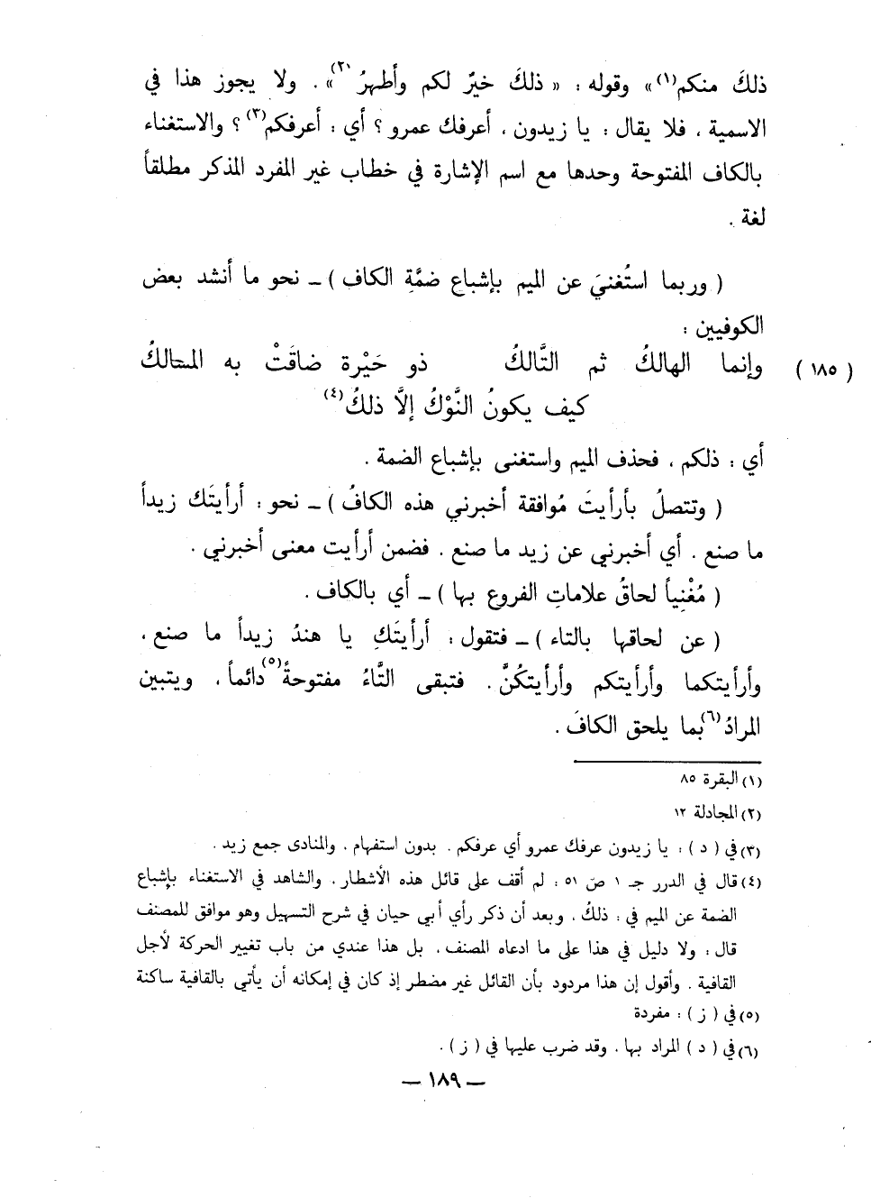 ذلك منكم" وقوله: "ذلك خير لكم وأطهر" ولا يجوز هذا في الاسمية، فلا يقال: يا زيدون، أعرفك عمرو؟ أي: أعرفكم؟ والاستغناء بالكاف المفتوحة وحدها مع اسم الإشارة في خطاب غير المفرد المذكر مطلقًا لغة.