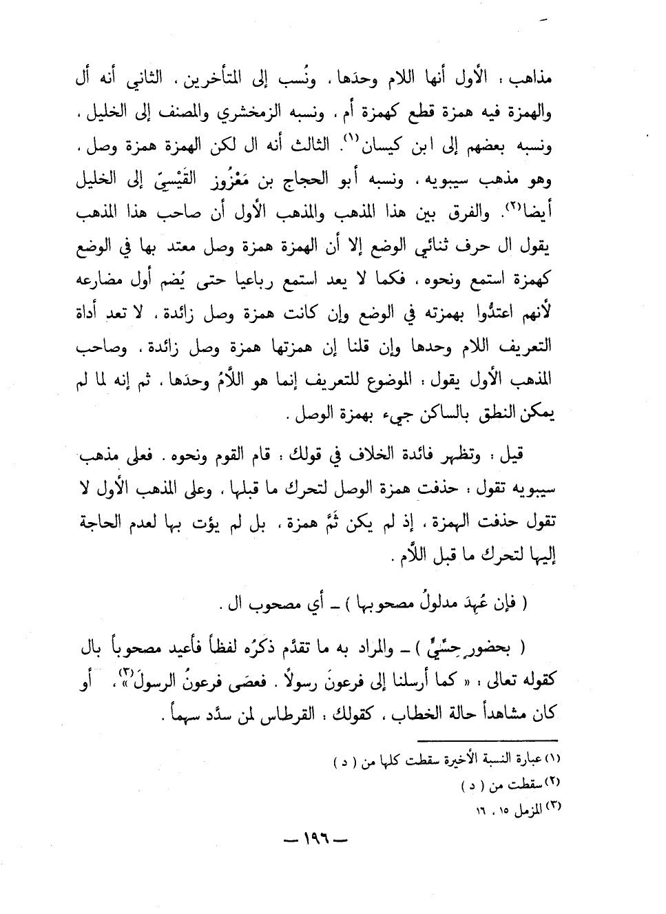 مذاهب: الأول أنها اللام وحدها، ونسب إلى المتأخرين، الثاني أنه أل والهمزة فيه همزة قطع كهمزة أم، ونسبه الزمخشري والمصنف إلى الخليل، ونسبه بعضهم إلى ابن كيسان. الثالث أنه ال لكن الهمزة همزة وصل، وهو مذهب سيبويه، ونسبه أبو الحجاج بن معزوز القيسي إلى الخليل أيضًا. والفرق بين هذا المذهب والمذهب الأول أن صاحب هذا المذهب يقول ال حرف ثنائي الوضع إلا أن الهمزة همزة وصل متعد بها في الوضع كهمزة استمع ونحوه، فكما لا يعد استمع رباعيًا حتى يضم أول مضارعه لأنهم اعتدوا بهمزته في الوضع وإن كانت همزة وصل زائدة، لا تعد أداة التعريف اللام وحدها وإن قلنا إن همزتها همزة وصل زائدة، وصاحب المذهب الأول يقول: الموضوع للتعريف إنما هو اللام وحدها، ثم إنه لما لم يمكن النطق بالساكن جيء بهمزة الوصل.
