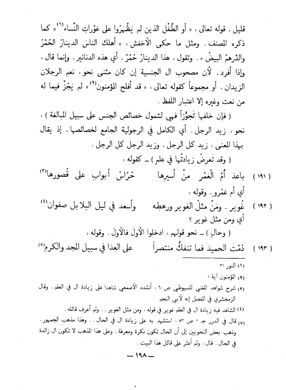 قليل، قوله تعالى: "أو الطفل الذين لم يظهروا على عورات النساء" كما ذكره المصنف، ومثل ما حكى الأخفش، "أهلك الناس الدينار الحمر والدرهم البيض". وتقول: هذا الدينار حُمْر، أي هذه الدنانير، وإنما قال: وإذا أفرد، لأن مصحوب ال الجنسية إن كان مثنى نحو: نعم الرجلان الزيدان، أو مجموعًا كقوله تعالى: "قد أفلح المؤمنون" لم يجز فيما له من نعت وغيره إلا اعتبار اللفظ.