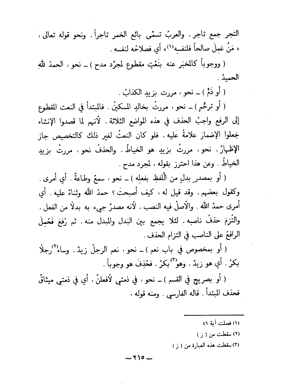 (أو ترحُّمٍ) - نحو: مررتُ بخالدٍ المسكينُ. فالمبتدأ في النعت المقطوع إلى الرفع واجبُ الحذف في هذه المواضع الثلاثة. لأنهم لما قصدوا الإنشاء جعلوا الإضمار علامةً عليه، فلو كان النعتُ لغير ذلك كالتخصيص جاز الإظهارُ. نحو: مررتُ بزيدٍ هو الخياطُ، والحذفُ نحو: مررتُ بزيدٍ الخياطُ. وعن هذا احترز بقوله: لمجرد مدح.