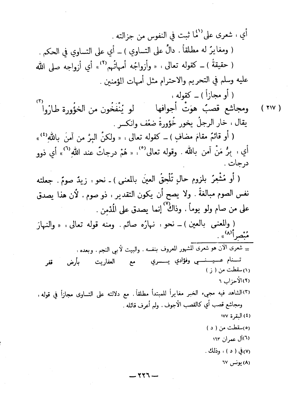 (أو قائمٌ مقام مضافٍ) - كقوله تعالى: "ولكن البر من آمن بالله" أي: برُّ مَنْ آمن بالله، وقوله تعالى: "هُمْ درجاتٌ عند الله" أي ذوو درجات.