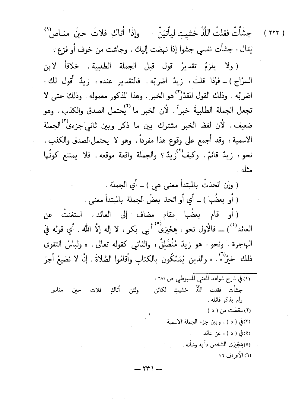 (222) جشأتْ فقلتُ اللذْ خشيت ليأتينْ ... وإذا أتاك فلات حين مناص
