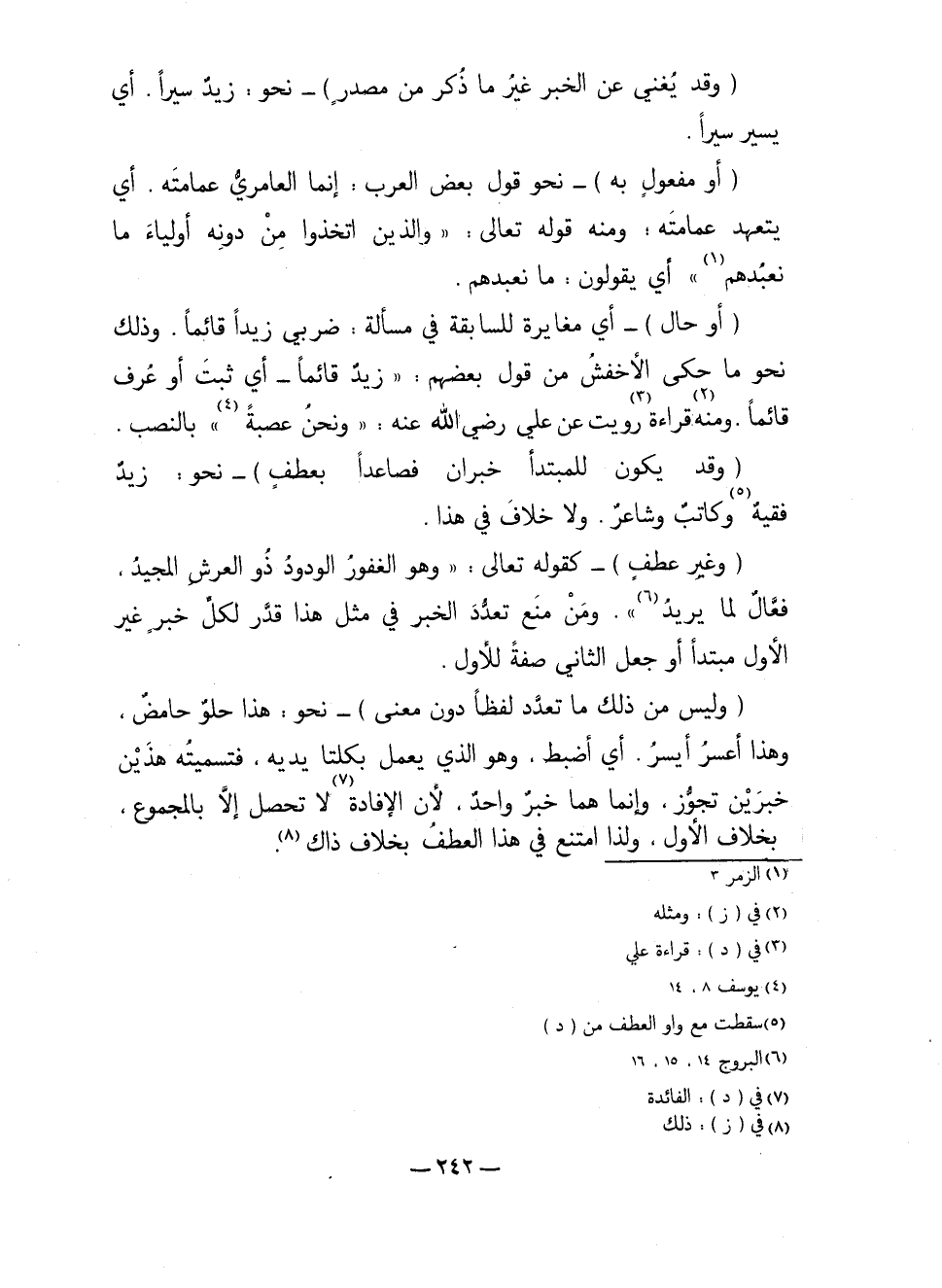 (وغير عطفٍ) - كقوله تعالى: "وهو الغفورُ الودودُ ذو العرش المجيد فعالٌ لما يريدُ". ومَنْ منع تعدد الخبر في مثل هذا قدر لكل خبرٍ غير الأول مبتدأ أو جعل الثاني صفة للأول.