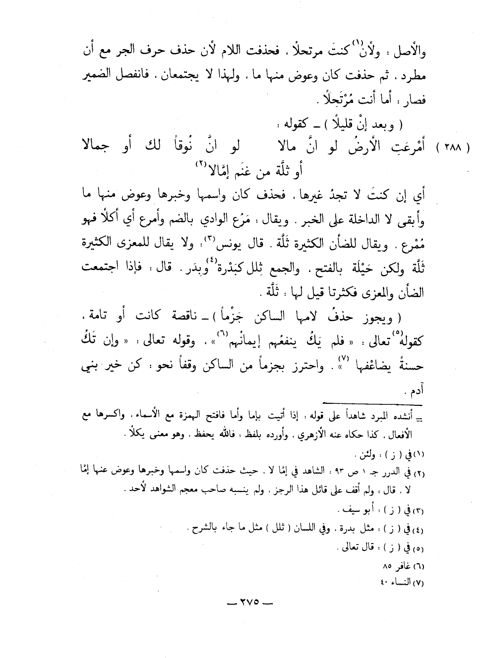 (ويجوز حذفُ لامها الساكن جزماً) - ناقصة كانت أو تامة، كقوله تعالى: "فلم يكُ ينفعهُم إيمانهم". وقوله تعالى: "وإن تكُ حسنة يضاعفها". واحترز بجزماً من الساكن وقفاً نحو: كن خير بني آدم.