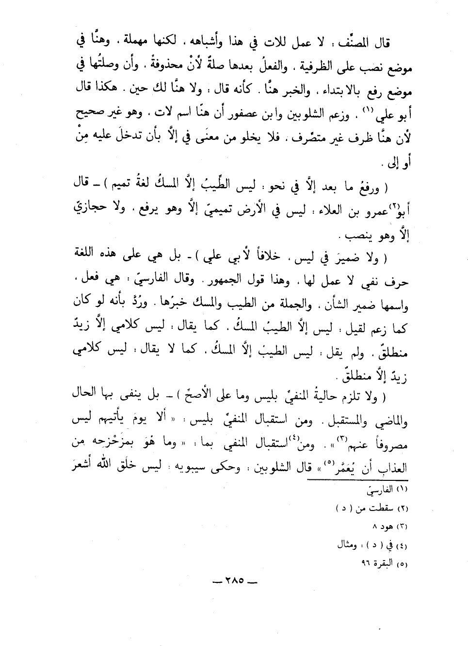 (ولا ضمير في ليس، خلافاً لأبي علي) - بل هي على هذه اللغة حرف نفي لا عمل لها، وهذا قول الجمهور، وقال الفارسي: هي فعل. واسمها ضمير الشأن، والجملة من الطيب والمسك خبرها. ورُد بأنه لو كان كما زعم لقيل: ليس إلا الطيب المسكُ، كما يقال: ليس كلامي إلا زيد منطلقٌ، ولم يقل: ليس الطيب إلا المسكُ، كما لا يقال: ليس كلامي زيدٌ إلا منطلقٌ.
