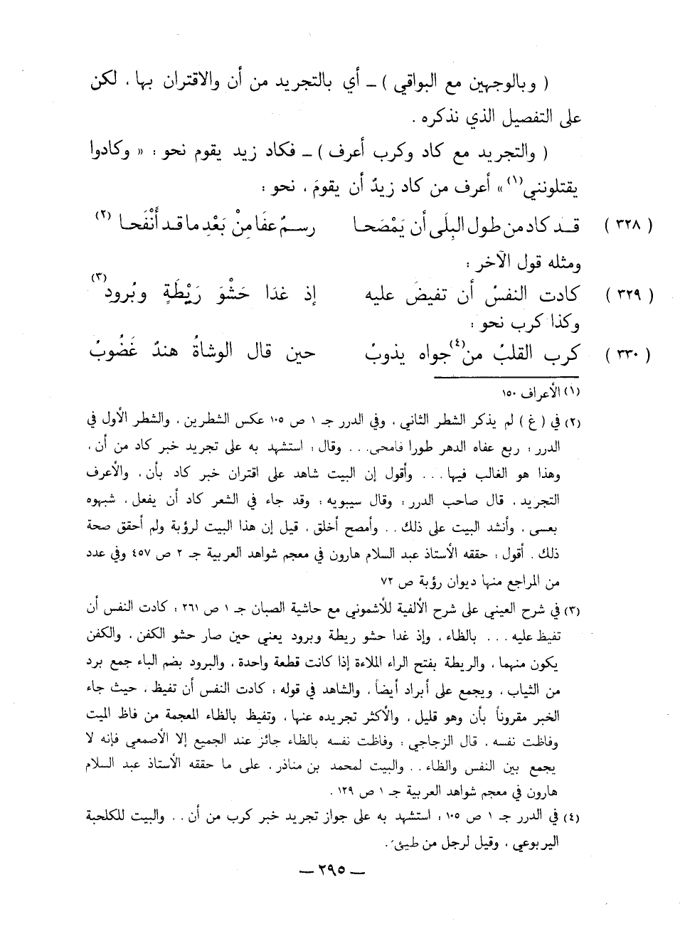 (والتجريد مع كاد وكرب أعرف) - فكاد زيد يقوم نحو: "وكادوا يقتلونني" أعرف من كاد زيدٌ أن يقوم، نحو: