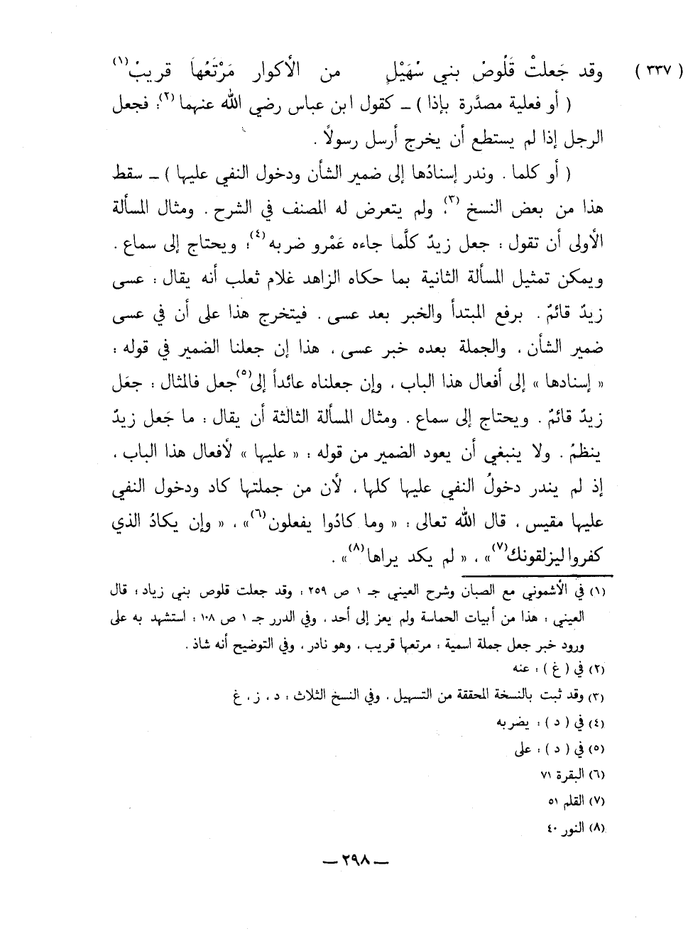 (أو كلما. وندر إسنادُها إلى ضمير الشأن ودخول النفي عليها) - سقط هذا من بعض النسخ، ولم يتعرض له المصنف في الشرح. ومثال المسألة الأولى أن تقول: جعل زيدٌ كلما جاءه عمرو ضربه، ويحتاج إلى سماع. ويمكن تمثيل المسألة الثانية بما حكاه الزاهد غلام ثعلب أنه يقال: عسى زيد قائم. برفع المبتدأ والخبر بعد عسى. فيتخرج هذا على أن في عسى ضمير الشأن. والجملة بعده خبر عسى، هذا إن جعلنا الضمير في قوله: "إسنادها" إلى أفعال هذا الباب، وإن جعلناه عائداً إلى جعل فالمثال: جعل زيدٌ قائمٌ. ويحتاج إلى سماع، ومثال المسألة الثالثة أن يقال: ما جعل زيد ينظم. ولا ينبغي أن يعود الضمير من قوله: "عليها" لأفعال هذا الباب، إذ لم يندر دخول النفي عليها كلها، لأن من جملتها كاد ودخول النفي عليها مقيس، قال الله تعالى: "وما كادوا يفعلون"، "وإن يكاد الذي كفروا ليزلقونك"، "لم يكد يراها".