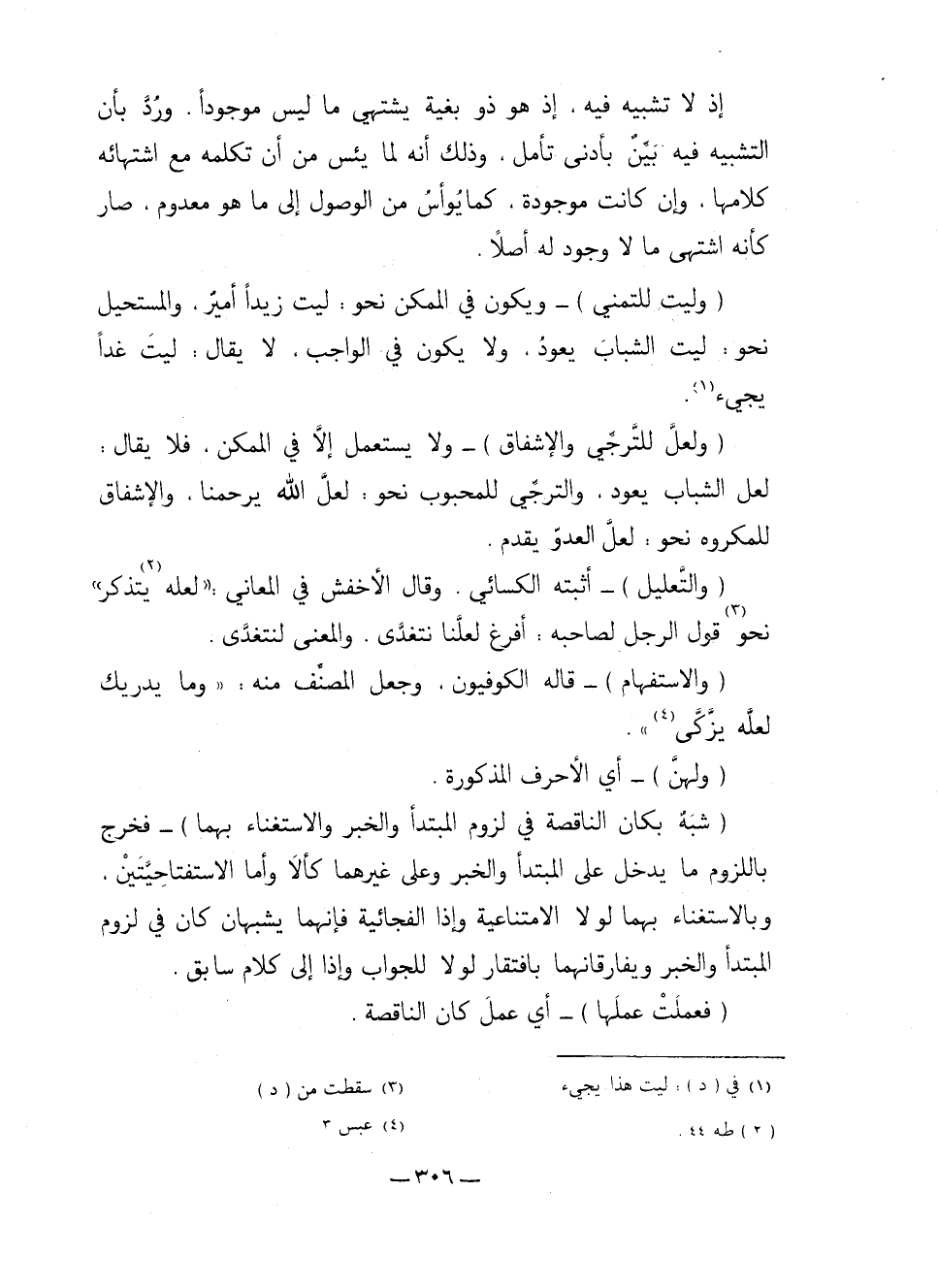 (وليت للتمني) - ويكون في الممكن نحو: ليت زيداً أميرٌ، والمستحيل نحو: ليت الشباب يعودُ، ولا يكون في الواجب، لا يقال: ليت غداً يجيء.