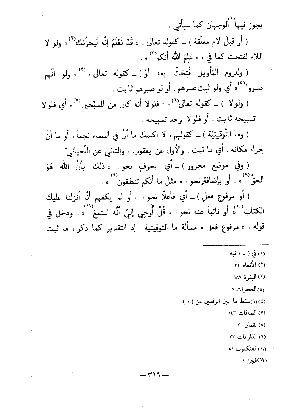 (ولولا) - كقوله تعالى: "فلولا أنه كان من المسبحين" أي فلولا تسبيحه ثابت، أو فلولا وجد تسبيحه.