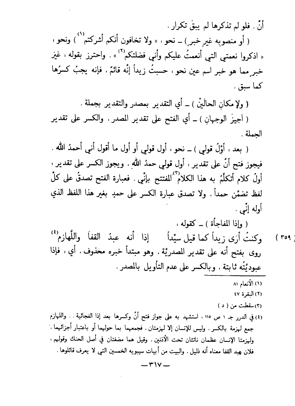 فيجوز فتح أن على تقدير: أول قولي حمدُ الله، ويجوز الكسر على تقدير: أول كلام أتكلمُ به هذا الكلام المفتتح بإني. فعبارة الفتح تصدق على كل لفظ تضمن حمداً، ولا تصدق عبارة الكسر على حمدٍ بغير هذا اللفظ الذي أوله إني.