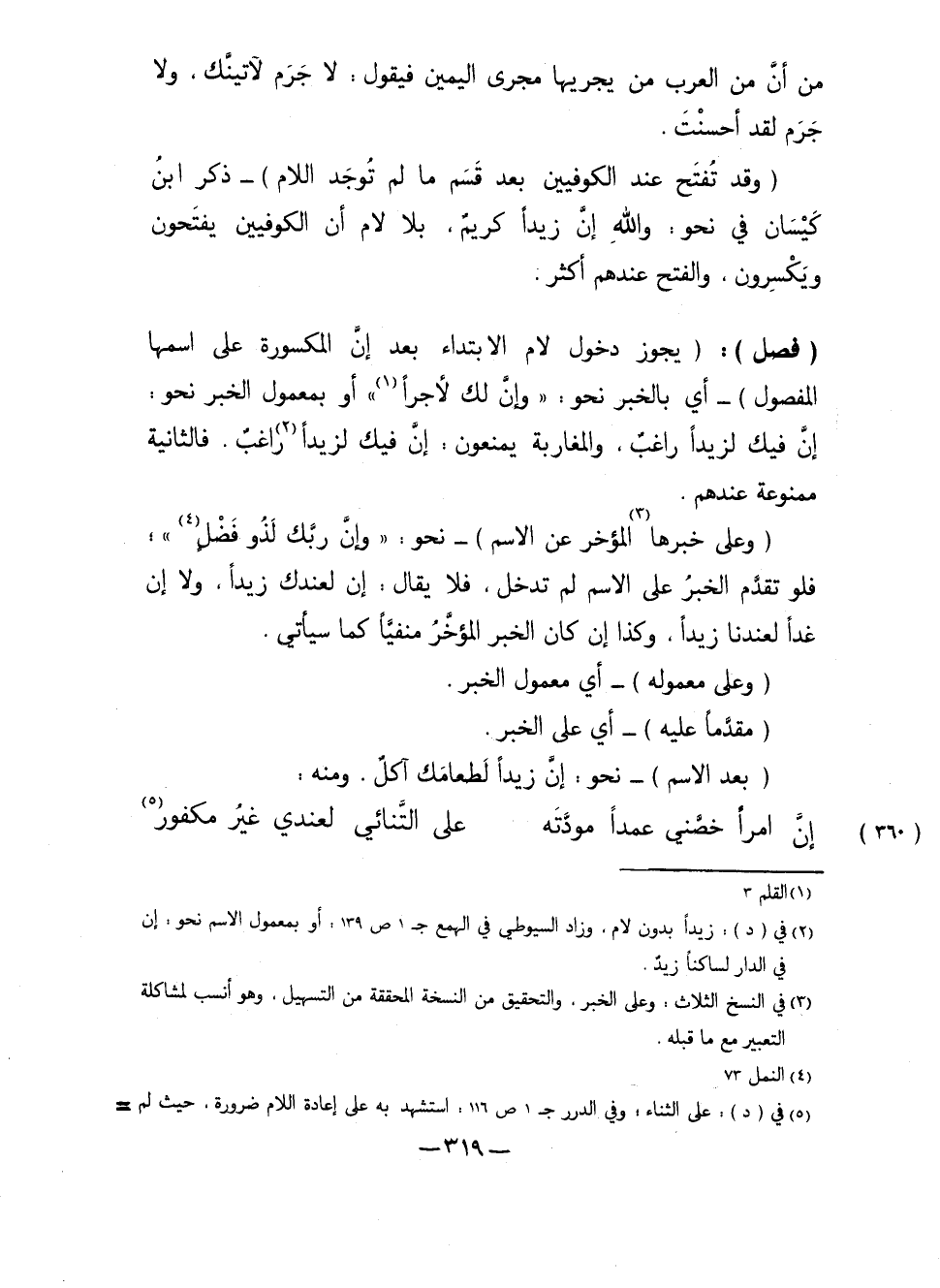 (فصل): (يجوز دخول لام الابتداء بعد إن المكسورة على اسمها المفصول) - أي بالخبر نحو: "وإن لك لأجراً" أو بمعمول الخبر نحو: إن فيك لزيداً راغب، والمغاربة يمنعون: إن فيك لزيداً راغب. فالثانية ممنوعة عندهم.
