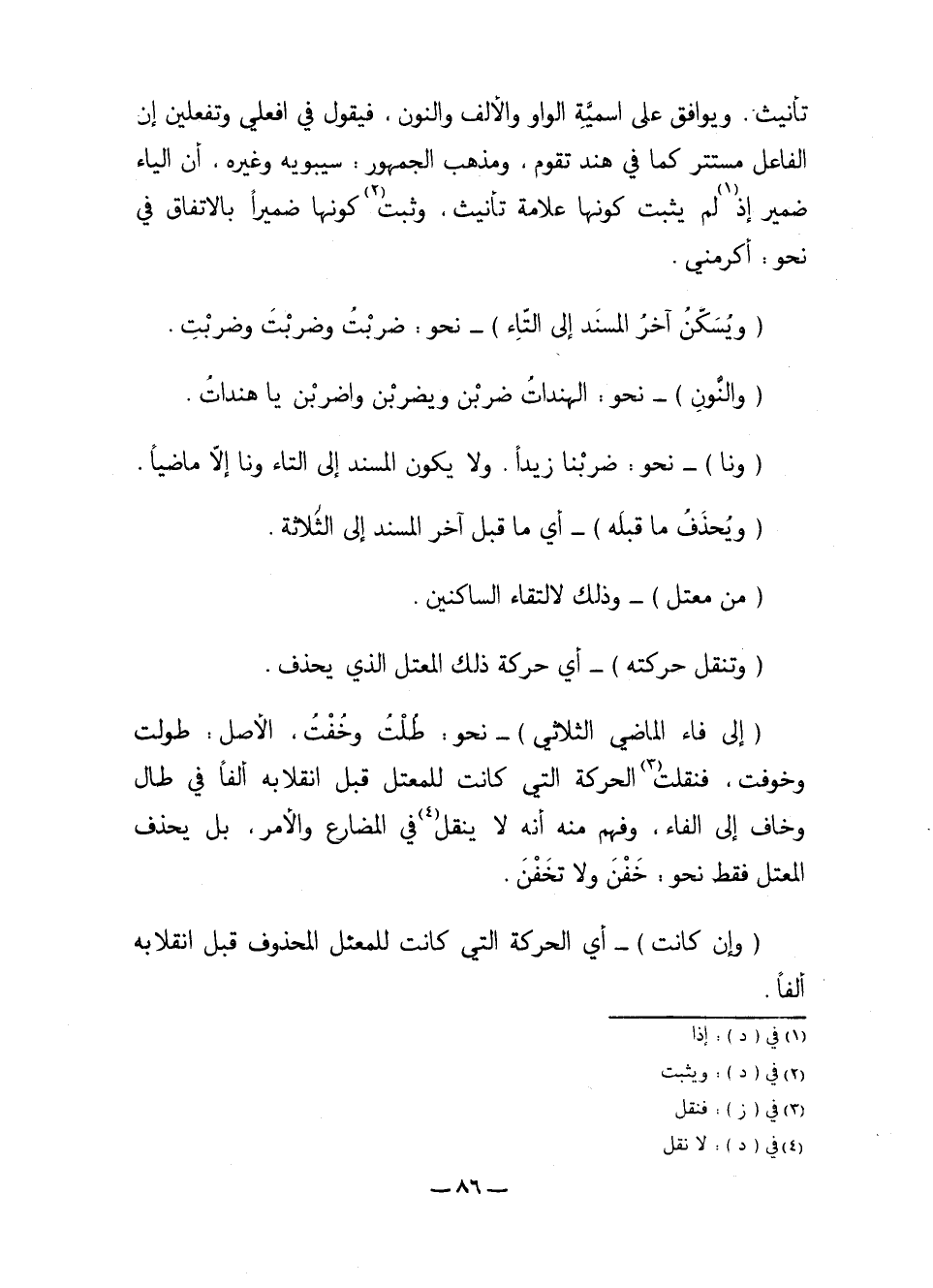 (ونا) -نحو: ضربنا زيدًا، ولا يكون المسند إلى التاء ونا إلا ماضيًا.