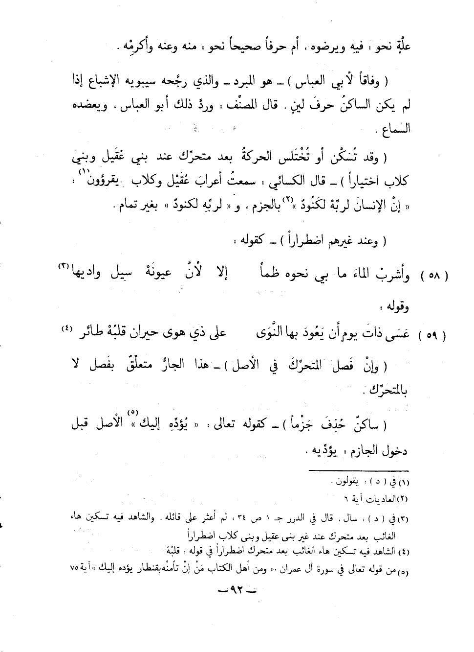 (وقد تسكن أو تختلس الحركة بعد متحرك عند بني عقيل وبني كلاب اختيارًا) -قال الكسائي: سمعت أعراب عقيل وكلاب يقرؤون: "إن الإنسان لربه لكنود" بالجزم، و"لربه لكنود" بغير تمام.