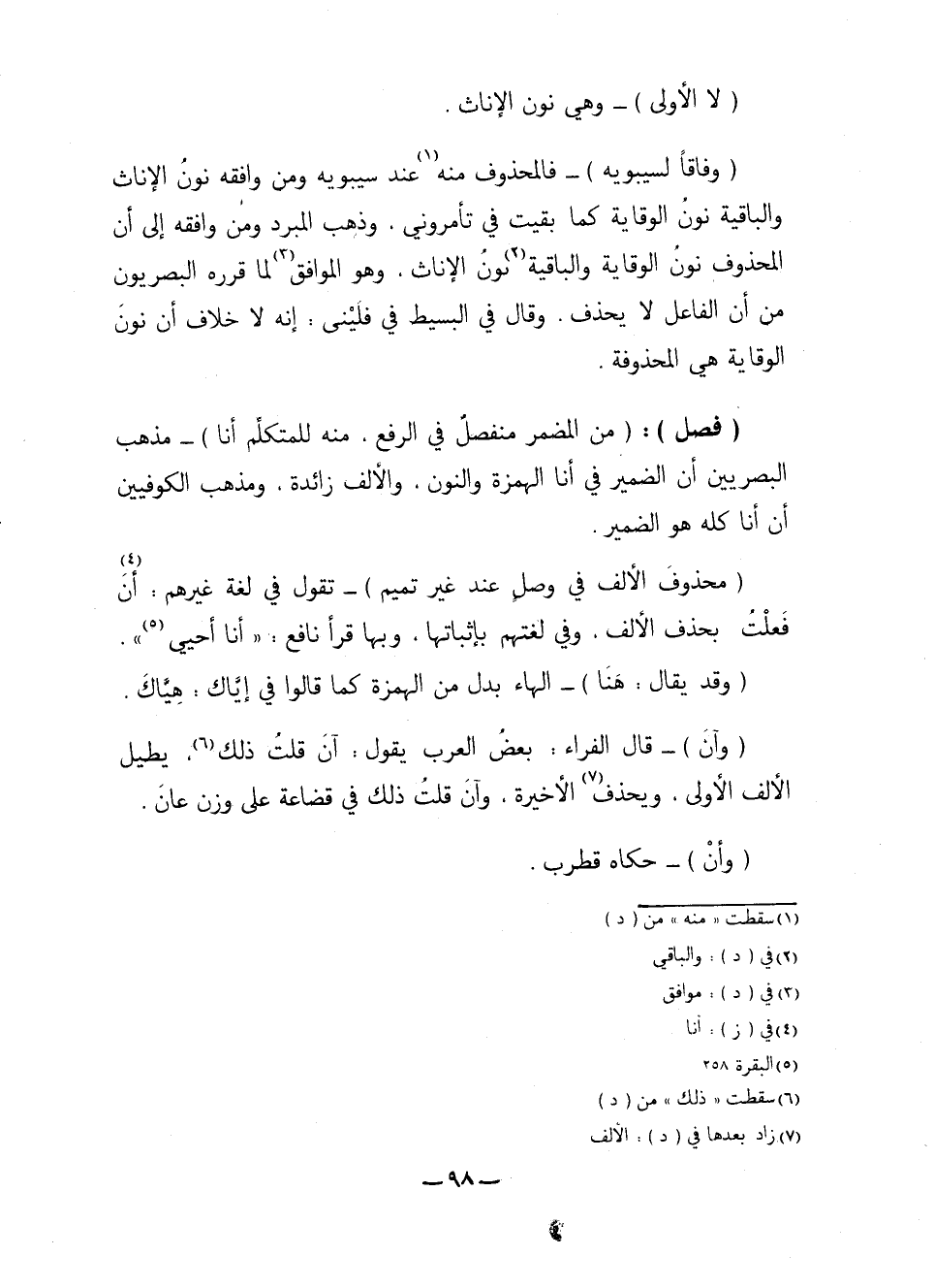(فصل): (من المضمر منفصل في الرفع، منه للمتكلم أنا) -مذهب البصريين أن الضمير في أنا الهمزة والنون، والألف زائدة، ومذهب الكوفيين أن أنا كله هو الضمير.