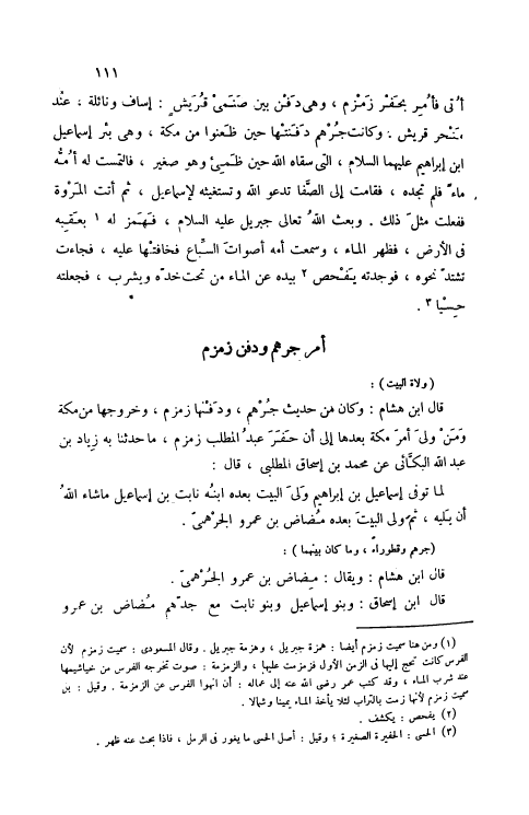 قَالَ ابْنُ هِشَامٍ: وَكَانَ مِنْ حَدِيثِ جُرْهُمٍ، وَدَفْنُهَا زَمْزَمَ، وَخُرُوجُهَا مِنْ مَكَّةَ وَمَنْ وَلِيَ أَمْرَ مَكَّةَ بَعْدَهَا إلَى أَنْ حَفَرَ عَبْدُ الْمُطَّلِبِ زَمْزَمَ، مَا حَدَّثَنَا بِهِ زِيَادُ بْنُ عَبْدِ اللَّهِ الْبَكَّائِيُّ عَنْ مُحَمَّدِ بْنِ إسْحَاقَ الْمُطَّلِبِيُّ، قَالَ:
