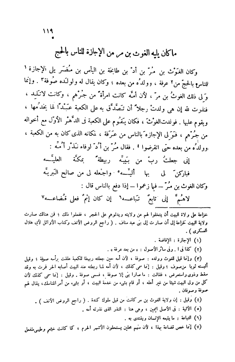 وَكَانَ الْغَوْثُ بْنُ مُرَّ بْنِ أَدِّ بْنِ طَابِخَةَ بْنِ إلْيَاسَ بْنِ مُضَرَ يَلِي الْإِجَازَةَ [1] لِلنَّاسِ بِالْحَجِّ مِنْ [2] عَرَفَةَ، وَوَلَدُهُ مِنْ بَعْدِهِ، وَكَانَ يُقَالُ لَهُ ولِوَلَدِهِ صُوفَةُ [3] . وَإِنَّمَا وَلِيَ ذَلِكَ الْغَوْثُ بْنُ مُرَّ، لِأَنَّ أُمَّهُ كَانَتْ امْرَأَةً مِنْ جُرْهُمٍ، وَكَانَتْ لَا تَلِدُ، فَنَذَرَتْ للَّه إنْ هِيَ وَلَدَتْ رَجُلًا أَنْ تَصَّدَّقَ بِهِ عَلَى الْكَعْبَةِ عَبْدًا لَهَا يَخْدُمُهَا، وَيَقُومُ عَلَيْهَا. فَوَلَدَتْ الْغَوْثَ، فَكَانَ يَقُومُ عَلَى الْكَعْبَةِ فِي الدَّهْرِ الْأَوَّلِ مَعَ أَخْوَالِهِ مِنْ جُرْهُمٍ، فَوَلِيَ الْإِجَازَةَ بِالنَّاسِ مِنْ عَرَفَةَ، لِمَكَانِهِ الَّذِي كَانَ بِهِ مِنْ الْكَعْبَةِ، وَوَلَدُهُ مِنْ بَعْدِهِ حَتَّى انْقَرَضُوا [4] . فَقَالَ مُرُّ بْنُ أَدٍّ لِوَفَاءِ نَذْرِ أُمِّهِ: