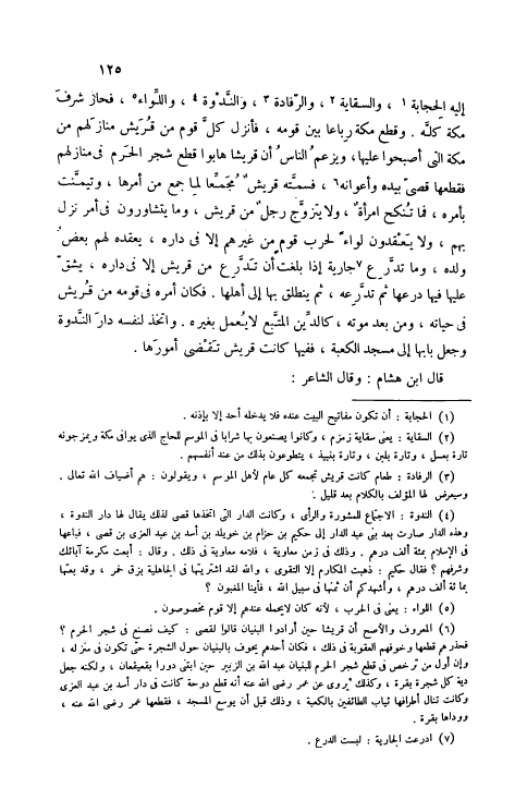 [4] الندوة: الِاجْتِمَاع للمشورة والرأى، وَكَانَت الدَّار الَّتِي اتخذها قصي لذَلِك يُقَال لَهَا دَار الندوة، وَهَذِه الدَّار صَارَت بعد بنى عبد الدَّار إِلَى حَكِيم بن حزَام بن خويلد بن أَسد بن عبد الْعُزَّى بن قصي، فَبَاعَهَا فِي الْإِسْلَام بِمِائَة ألف دِرْهَم. وَذَلِكَ فِي زمن مُعَاوِيَة، فلامه مُعَاوِيَة فِي ذَلِك. وَقَالَ: أبعت مكرمَة آبَائِك وشرفهم؟ فَقَالَ حَكِيم: ذهبت المكارم إِلَّا التَّقْوَى، وَالله لقد اشْتَرَيْتهَا فِي الْجَاهِلِيَّة بزق خمر، وَقد بعتها بِمِائَة ألف دِرْهَم، وأشهدكم أَن ثمنهَا فِي سَبِيل الله، فأينا المغبون؟