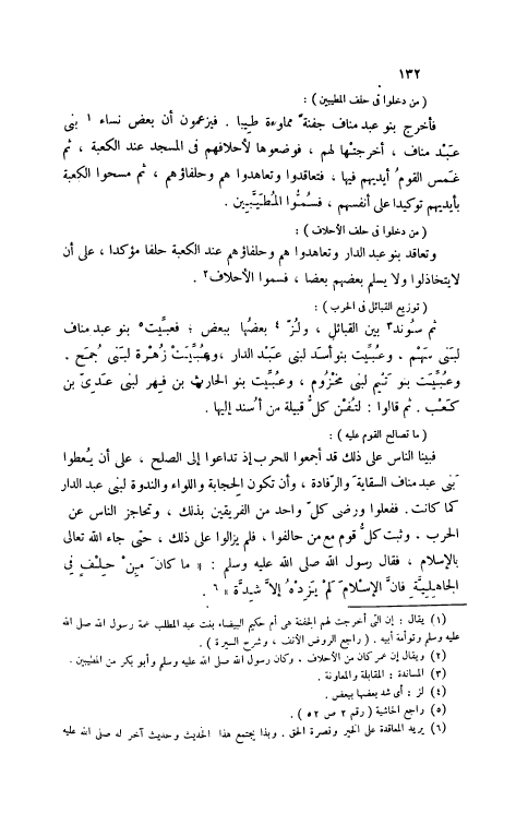 فَبَيْنَا النَّاسُ عَلَى ذَلِكَ قَدْ أَجَمَعُوا لِلْحَرْبِ إذْ تَدَاعَوْا إلَى الصُّلْحِ، عَلَى أَنْ يُعْطُوا بَنِي عَبْدِ مَنَافٍ السِّقَايَةَ وَالرِّفَادَةَ، وَأَنْ تَكُونَ الْحِجَابَةُ وَاللِّوَاءُ وَالنَّدْوَةُ لِبَنِي عَبْدِ الدَّارِ كَمَا كَانَتْ. فَفَعَلُوا وَرَضِيَ كُلُّ وَاحِدٍ مِنْ الْفَرِيقَيْنِ بِذَلِكَ، وَتَحَاجَزَ النَّاسُ عَنْ الْحَرْبِ، وَثَبَتَ كُلُّ قَوْمٍ مَعَ مَنْ حَالَفُوا، فَلَمْ يَزَالُوا عَلَى ذَلِكَ، حَتَّى جَاءَ اللَّهُ تَعَالَى بِالْإِسْلَامِ، فَقَالَ رَسُولُ اللَّهِ صَلَّى اللهُ عَلَيْهِ وَسَلَّمَ: «مَا كَانَ مِنْ حِلْفٍ فِي الْجَاهِلِيَّةِ فَإِنَّ الْإِسْلَامَ لَمْ يَزِدْهُ إلَّا شِدَّةً» [6] .