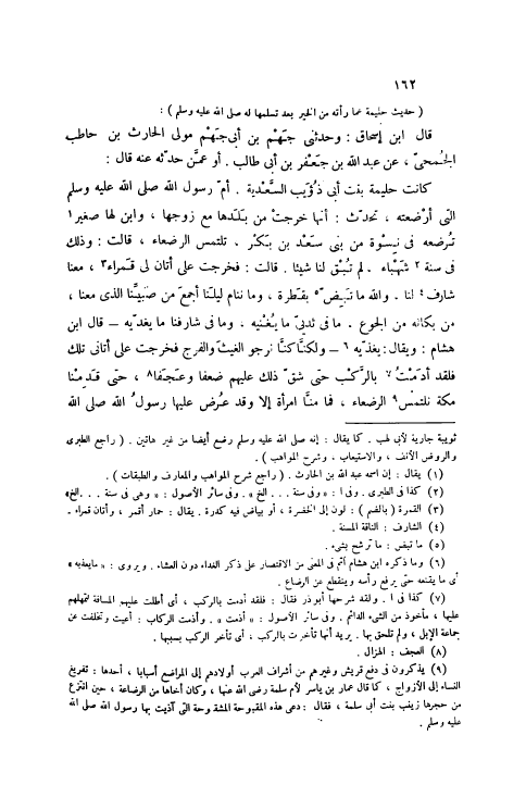 كَانَتْ حَلِيمَةُ بِنْتُ أَبِي ذُؤَيْبٍ السَّعْدِيَّةُ. أُمَّ رَسُولِ اللَّهِ صَلَّى اللهُ عَلَيْهِ وَسَلَّمَ الَّتِي أَرْضَعَتْهُ، تُحَدِّثُ: أَنَّهَا خَرَجَتْ مِنْ بَلَدِهَا مَعَ زَوْجِهَا، وَابْنٍ لَهَا صَغِيرٍ [1] تُرْضِعُهُ فِي نِسْوَةٍ مِنْ بَنِي سَعْدِ بْنِ بَكْرٍ، تَلْتَمِسُ الرُّضَعَاءَ، قَالَتْ: وَذَلِكَ فِي سَنَةٍ [2] شَهْبَاءَ، لَمْ تُبْقِ لَنَا شَيْئًا. قَالَتْ: فَخَرَجَتْ عَلَى أَتَانٍ لِي قَمْرَاءَ [3] ، مَعَنَا شَارِفٌ [4] لَنَا، وَالله مَا نبض [5] بِقَطْرَةٍ، وَمَا نَنَامُ لَيْلَنَا أَجْمَعَ مِنْ صَبِيِّنَا الَّذِي مَعَنَا، مِنْ بُكَائِهِ مِنْ الْجَوْعِ، مَا فِي ثَدْيَيَّ مَا يُغْنِيهِ، وَمَا فِي شَارِفِنَا مَا يُغَدِّيهِ- قَالَ ابْنُ هِشَامٍ: وَيُقَالُ: يُغَذِّيهِ [6]- وَلَكِنَّا كُنَّا نَرْجُو الْغَيْثَ وَالْفَرَجَ فَخَرَجْتُ عَلَى أَتَانِي تِلْكَ فَلَقَدْ أَدَمْتُ [7] بِالرَّكْبِ حَتَّى شَقَّ ذَلِكَ عَلَيْهِمْ ضَعْفًا وَعَجَفًا [8] ، حَتَّى قَدِمْنَا مَكَّةَ نَلْتَمِسُ [9] الرُّضَعَاءَ، فَمَا مِنَّا امْرَأَةٌ إلَّا وَقَدْ عُرِضَ عَلَيْهَا رَسُولُ اللَّهِ صَلَّى اللَّهُ