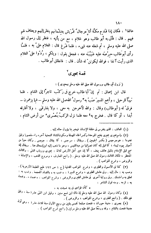 [2] وَاسم بحيرى بحيرى بِفَتْح الْمُوَحدَة وَكسر الْحَاء الْمُهْملَة وَسُكُون الْمُثَنَّاة التَّحْتِيَّة آخِره رَاء مَقْصُورا وَقيل ممدودا: هُوَ جرجيس (بِكَسْر الجيمين) . وَيُقَال: سرجس، كَمَا يُقَال: جرجس. وَكَانَ حبرًا من أَحْبَار يهود تيماء، كَمَا قيل إِنَّه كَانَ نَصْرَانِيّا من عبد الْقَيْس، وَهُوَ مَا ذهب إِلَيْهِ ابْن إِسْحَاق هُنَا. وَيُقَال إِنَّه سمع قبل الْإِسْلَام بِقَلِيل هَاتِف يَهْتِف: أَلا إِن خير أهل الأَرْض ثَلَاثَة: بحيرى ورباب الشنى، وَالثَّالِث المنتظر، فَكَانَ الثَّالِث رَسُول الله صَلَّى اللهُ عَلَيْهِ وَسَلَّمَ. (رَاجع المعارف، ومروج الذَّهَب، والإصابة، وَالرَّوْض، وَشرح الْمَوَاهِب) .
