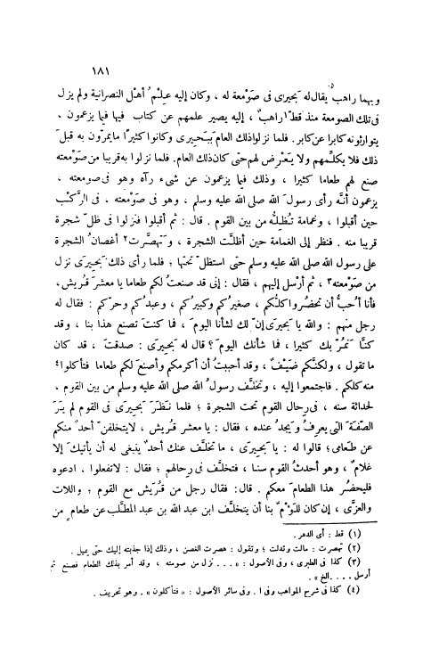 وَبِهِمَا رَاهِبٌ يُقَالُ لَهُ بَحِيرَى فِي صَوْمَعَةٍ لَهُ، وَكَانَ إلَيْهِ عِلْمُ أَهْلِ النَّصْرَانِيَّةِ وَلَمْ يَزَلْ فِي تِلْكَ الصَّوْمَعَةِ مُنْذُ قَطُّ [1] رَاهِبٌ، إلَيْهِ يَصِيرُ عِلْمُهُمْ عَنْ كِتَابٍ فِيهَا فِيمَا يَزْعُمُونَ، يَتَوَارَثُونَهُ كَابِرًا عَنْ كَابِرٍ. فَلَمَّا نَزَلُوا ذَلِكَ الْعَامَ بِبَحِيرَى وَكَانُوا كَثِيرًا مَا يَمُرُّونَ بِهِ قَبْلَ ذَلِكَ فَلَا يُكَلِّمُهُمْ وَلَا يَعْرِضُ لَهُمْ حَتَّى كَانَ ذَلِكَ الْعَامُ. فَلَمَّا نَزَلُوا بِهِ قَرِيبًا مِنْ صَوْمَعَتِهِ صَنَعَ لَهُمْ طَعَامًا كَثِيرًا، وَذَلِكَ فِيمَا يَزْعُمُونَ عَنْ شَيْءٍ رَآهُ وَهُوَ فِي صَوْمَعَتِهِ، يَزْعُمُونَ أَنَّهُ رَأَى رَسُولَ اللَّهِ صَلَّى اللهُ عَلَيْهِ وَسَلَّمَ، وَهُوَ فِي صَوْمَعَتِهِ، فِي الرَّكْبِ حِينَ أَقْبَلُوا، وَغَمَامَةٌ تُظِلُّهُ مِنْ بَيْنِ الْقَوْمِ. قَالَ: ثُمَّ أَقْبَلُوا فَنَزَلُوا فِي ظِلِّ شَجَرَةٍ قَرِيبًا مِنْهُ. فَنَظَرَ إلَى الْغَمَامَةِ حَيْنَ أَظَلَّتْ الشَّجَرَةُ، وَتَهَصَّرَتْ [2] أَغْصَانُ الشَّجَرَةِ عَلَى رَسُولِ اللَّهِ صَلَّى اللهُ عَلَيْهِ وَسَلَّمَ حَتَّى اسْتَظَلَّ تَحْتَهَا، فَلَمَّا رَأَى ذَلِكَ بَحِيرَى نَزَلَ مِنْ صَوْمَعَتِهِ [3] ، ثُمَّ أَرْسَلَ إلَيْهِمْ، فَقَالَ: إنِّي قَدْ صَنَعْتُ لَكُمْ طَعَامًا يَا مَعْشَرَ قُرَيْشٍ، فَأَنَا أُحِبُّ أَنْ تَحْضُرُوا كُلُّكُمْ، صَغِيرُكُمْ وَكَبِيرُكُمْ، وَعَبْدُكُمْ وَحُرُّكُمْ: فَقَالَ لَهُ رَجُلٌ مِنْهُمْ: وَاَللَّهِ يَا بَحِيرَى إنَّ لَكَ لَشَأْنًا الْيَوْمَ، فَمَا كُنْتَ تَصْنَعُ هَذَا بِنَا، وَقَدْ كُنَّا نَمُرُّ بِكَ كَثِيرًا، فَمَا شَأْنُكَ الْيَوْمَ؟ قَالَ لَهُ بَحِيرَى: صَدَقْتَ، قَدْ كَانَ مَا تَقُولُ، وَلَكِنَّكُمْ ضَيْفٌ، وَقَدْ أَحْبَبْتُ أَنْ أُكْرِمَكُمْ وَأَصْنَعَ لَكُمْ طَعَامًا فَتَأْكُلُوا [4] مِنْهُ كُلُّكُمْ. فَاجْتَمِعُوا إلَيْهِ، وَتَخَلَّفَ رَسُولُ اللَّهِ صَلَّى اللهُ عَلَيْهِ وَسَلَّمَ مِنْ بَيْنِ الْقَوْمِ، لِحَدَاثَةِ سِنِّهِ، فِي رِحَالِ الْقَوْمِ تَحْتَ الشَّجَرَةِ، فَلَمَّا نَظَرَ بَحِيرَى فِي الْقَوْمِ لَمْ يَرَ الصِّفَةَ الَّتِي يَعْرِفُ وَيَجِدُ عِنْدَهُ، فَقَالَ: يَا مَعْشَرَ قُرَيْشٍ، لَا يَتَخَلَّفَنَّ أَحَدٌ مِنْكُمْ عَنْ طَعَامِي، قَالُوا لَهُ: يَا بَحِيرَى، مَا تَخَلَّفَ عَنْكَ أَحَدٌ يَنْبَغِي لَهُ أَنْ يَأْتِيَكَ إلَّا غُلَامٌ، وَهُوَ أَحْدَثُ الْقَوْمِ سِنًّا، فَتَخَلَّفَ فِي رِحَالِهِمْ، فَقَالَ: لَا تَفْعَلُوا، اُدْعُوهُ فَلِيَحْضُرْ هَذَا الطَّعَامَ مَعَكُمْ. قَالَ: فَقَالَ رَجُلٌ مِنْ قُرَيْشٍ مَعَ الْقَوْمِ، وَاَللَّاتِ وَالْعُزَّى، إنْ كَانَ لَلُؤْمٌ بِنَا أَنْ يَتَخَلَّفَ ابْنُ عَبْدِ اللَّهِ بْنِ عَبْدِ الْمُطَّلِبِ عَنْ طَعَامٍ مِنْ