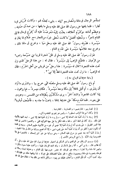 فَنَزَلَ رَسُولُ اللَّهِ صَلَّى اللهُ عَلَيْهِ وَسَلَّمَ فِي ظِلِّ شَجَرَةٍ قَرِيبًا مِنْ صَوْمَعَةِ رَاهِبٍ [2] مِنْ الرُّهْبَانِ، فَاطَّلَعَ الرَّاهِبُ إلَى مَيْسَرَةَ، فَقَالَ لَهُ: مَنْ هَذَا الرَّجُلُ الَّذِي نَزَلَ تَحْتَ هَذِهِ الشَّجَرَةِ؟ قَالَ لَهُ مَيْسَرَةُ: هَذَا رَجُلٌ مِنْ قُرَيْشٍ مِنْ أَهْلِ الْحَرَمِ، فَقَالَ لَهُ الرَّاهِبُ: مَا نَزَلَ تَحْتَ هَذِهِ الشَّجَرَةِ قَطُّ إلَّا نَبِيٌّ [3] .