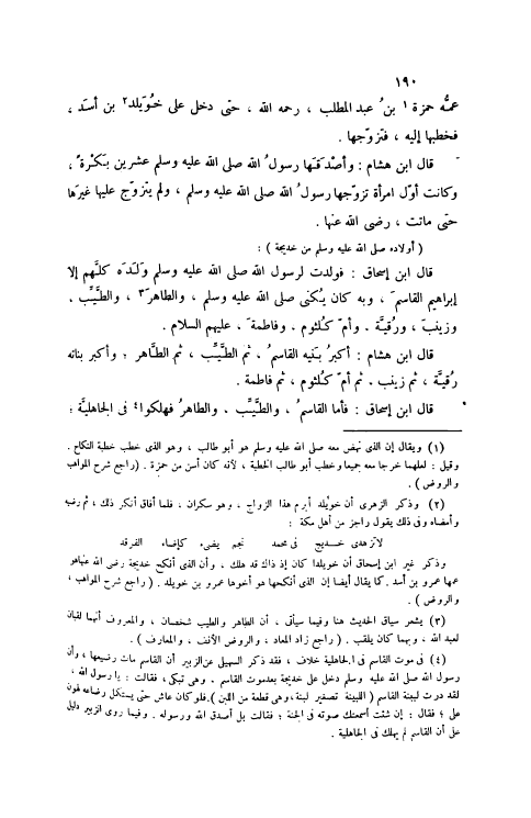 قَالَ ابْنُ إسْحَاقَ: فَوَلَدَتْ لِرَسُولِ اللَّهِ صَلَّى اللهُ عَلَيْهِ وَسَلَّمَ وَلَدَهُ كُلَّهُمْ إلَّا إبْرَاهِيمَ الْقَاسِمَ، وَبَهْ كَانَ يُكَنَّى صَلَّى اللهُ عَلَيْهِ وَسَلَّمَ، وَالطَّاهِرَ [3] ، وَالطَّيِّبَ، وَزَيْنَبَ، وَرُقَيَّةَ، وَأُمَّ كُلْثُومٍ، وَفَاطِمَةَ، عَلَيْهِمْ السِّلَامُ.