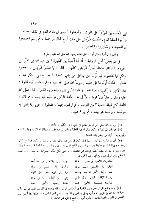 [3] أَي بِنَاحِيَة من زواياه. وَلما فعلوا كَانَ فِي ربع عبد منَاف عتبَة بن ربيعَة، وَكَانَ فِي الرّبع الثَّانِي زَمعَة، وَفِي الثَّالِث أَبُو حُذَيْفَة بن الْمُغيرَة، وَفِي الرَّابِع قيس بن عدي. وَقد تمّ بِنَاء الْكَعْبَة قبل الْهِجْرَة بثمان عشرَة سنة، بعد أَن حلت كلمة الْوِفَاق مَحل الشقاق، ورضى الْكل بِحكمِهِ صلوَات الله عَلَيْهِ. وَإِلَى قَضِيَّة التَّحْكِيم يُشِير قَول هُبَيْرَة بن أَبى وهب المَخْزُومِي:
