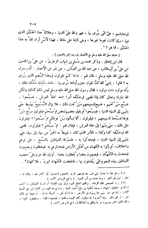 قَالَ ابْنُ إسْحَاقَ: وَذَكَرَ مُحَمَّدُ بْنُ مُسْلِمِ بْنِ شِهَابٍ الزُّهْرِيُّ، عَنْ عَلِيِّ بْنِ الْحُسَيْنِ ابْن عَلِيِّ بْنِ أَبِي طَالِبٍ، عَنْ عَبْدِ اللَّهِ بْنِ الْعَبَّاسِ، عَنْ نَفَرٍ مِنْ الْأَنْصَارِ: أَنَّ رَسُولَ اللَّهِ صَلَّى اللهُ عَلَيْهِ وَسَلَّمَ، قَالَ لَهُمْ: مَاذَا كُنْتُمْ تَقُولُونَ فِي هَذَا النَّجْمِ الَّذِي يُرْمَى بِهِ؟ قَالُوا: يَا نَبِيَّ اللَّهِ كُنَّا نَقُولُ حَيْنَ رَأَيْنَاهَا يُرْمَى بِهَا: مَاتَ مَلِكٌ مُلِّكَ مُلْكٌ، وُلِدَ مَوْلُودٌ مَاتَ مَوْلُودٌ، فَقَالَ رَسُولُ اللَّهِ صَلَّى اللهُ عَلَيْهِ وَسَلَّمَ لَيْسَ ذَلِكَ كَذَلِكَ وَلَكُنَّ اللَّهَ تَبَارَكَ وَتَعَالَى كَانَ إذَا قَضَى فِي خَلْقِهِ أَمْرًا سَمِعَهُ حَمَلَةُ الْعَرْشِ، فَسَبَّحُوا، فَسَبَّحَ مَنْ تَحْتَهُمْ، فَسَبَّحَ لِتَسْبِيحِهِمْ مَنْ تَحْتَ ذَلِكَ، فَلَا يَزَالُ التَّسْبِيحُ يَهْبِطُ حَتَّى يَنْتَهِيَ إلَى السَّمَاءِ الدُّنْيَا، فَيُسَبِّحُوا ثُمَّ يَقُولُ بَعْضُهُمْ لِبَعْضٍ مِمَّ سَبَّحْتُمْ فَيَقُولُونَ سَبَّحَ مَنْ فَوْقَنَا فَسَبَّحْنَا لِتَسْبِيحِهِمْ، فَيَقُولُونَ: أَلَا تَسْأَلُونَ مَنْ فَوْقَكُمْ مِمَّ سَبَّحُوا؟ فَيَقُولُونَ مِثْلَ ذَلِكَ، حَتَّى يَنْتَهُوا إلَى حَمَلَةِ الْعَرْشِ، فَيُقَالُ لَهُمْ: مِمَّ سَبَّحْتُمْ؟ فَيَقُولُونَ: قَضَى اللَّهُ فِي خَلْقِهِ كَذَا وَكَذَا، لِلْأَمْرِ الَّذِي كَانَ، فَيَهْبِطُ بِهِ الْخَبَرُ مِنْ سَمَاءٍ إلَى سَمَاءٍ حَتَّى يَنْتَهِي إلَى السَّمَاءِ الدُّنْيَا، فَيَتَحَدَّثُوا بِهِ، فَتَسْتَرِقُهُ الشَّيَاطِينُ بِالسَّمْعِ، عَلَى تَوَهُّمٍ وَاخْتِلَافٍ، ثُمَّ يَأْتُوا بِهِ الْكُهَّانَ مِنْ أَهْلِ الْأَرْضِ فَيُحَدِّثُوهُمْ بِهِ فَيُخْطِئُونَ وَيُصِيبُونَ فَيَتَحَدَّثُ بِهِ الْكُهَّانُ، فَيُصِيبُونَ بَعْضًا وَيُخْطِئُونَ بَعْضًا. ثُمَّ إنَّ اللَّهَ عَزَّ وَجَلَّ حَجَبَ الشَّيَاطِينَ بِهَذِهِ النُّجُومِ الَّتِي يُقْذَفُونَ بِهَا، فَانْقَطَعَتْ الْكَهَانَةُ الْيَوْمَ، فَلَا كَهَانَةَ [2] .