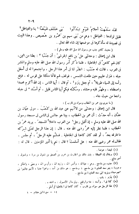 قَالَ ابْنُ إسْحَاقَ: وَحَدَّثَنِي مَنْ لَا أَتَّهِمُ عَنْ عَبْدِ اللَّهِ بْنِ كَعْبٍ، مَوْلَى عُثْمَانَ بْنِ عَفَّانَ، أَنَّهُ حَدَّثَ: أَنَّ عُمَرَ بْنَ الْخَطَّابِ، بَيْنَا هُوَ جَالِسٌ فِي النَّاسِ فِي مَسْجِدِ رَسُولِ اللَّهِ صَلَّى اللهُ عَلَيْهِ وَسَلَّمَ، إذْ أَقْبَلَ رَجُلٌ [6] مِنْ الْعَرَبِ دَاخِلًا الْمَسْجِدَ، يُرِيدُ عُمْرَ بْنَ الْخَطَّابِ، فَلَمَّا نَظَرَ إلَيْهِ عُمَرُ رَضِيَ اللَّهُ عَنْهُ، قَالَ: إنَّ هَذَا الرَّجُلُ لَعَلَى شِرْكِهِ مَا فَارَقَهُ بَعْدُ، أَوْ لَقَدْ كَانَ كَاهِنًا فِي الْجَاهِلِيَّةِ. فَسَلَّمَ عَلَيْهِ الرَّجُلُ، ثُمَّ جَلَسَ، فَقَالَ لَهُ عُمَرُ رَضِيَ اللَّهُ عَنْهُ: هَلْ أَسْلَمْتَ؟ قَالَ: نَعَمْ يَا أَمِيرَ الْمُؤْمِنِينَ، قَالَ لَهُ:
