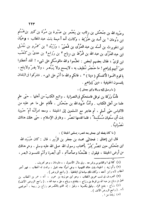 وَعُبَيْدِ اللَّهِ بْنِ جَحْشِ بْنِ رِئَابِ بْنِ يَعْمُرَ بْنِ صَبْرَةَ بْنِ مُرَّةَ بْنِ كَبِيرِ بْنِ غَنْمِ ابْن دُودَانَ [1] بْنِ أَسَدِ بْنِ خُزَيْمَةَ، وَكَانَتْ أُمُّهُ أُمَيْمَةَ بِنْتَ عَبْدِ الْمُطَّلِبِ، وَعُثْمَانِ ابْن الْحُوَيْرِثِ بْنِ أَسَدِ بْنِ عَبْدِ الْعُزَّى بْنِ قُصَيٍّ، وَزَيْدِ [2] بْنِ عَمْرِو بْنِ نُفَيْلِ ابْن عَبْدِ الْعُزَّى بْنِ عَبْدِ اللَّهِ بْنِ قُرْطِ بْنِ رِيَاحِ [3] بْنِ رَزَاحِ [4] بْنِ عَدِيِّ بْنِ كَعْبِ ابْن لُؤَيٍّ، فَقَالَ بَعْضُهُمْ لِبَعْضٍ: تَعَلَّمُوا وَاَللَّهِ مَا قَوْمُكُمْ عَلَى شَيْءٍ! لَقَدْ أَخْطَئُوا دِينَ أَبِيهِمْ إبْرَاهِيمَ! مَا حَجَرٌ نُطِيفُ بِهِ، لَا يَسْمَعُ وَلَا يُبْصِرُ، وَلَا يَضُرُّ وَلَا يَنْفَعُ، يَا قَوْمِ الْتَمِسُوا لِأَنْفُسِكُمْ (دِينًا) [5] ، فَإِنَّكُمْ وَاَللَّهِ مَا أَنْتُمْ عَلَى شَيْءٍ. فَتَفَرَّقُوا فِي الْبُلْدَانِ يَلْتَمِسُونَ الْحَنِيفِيَّةَ، دِينَ إبْرَاهِيمَ.